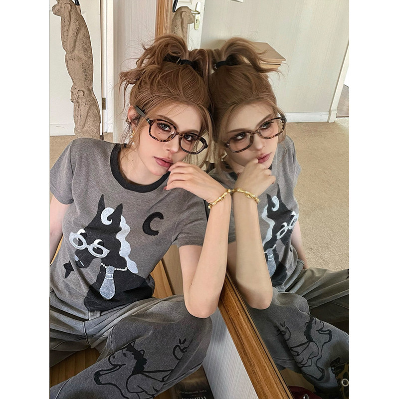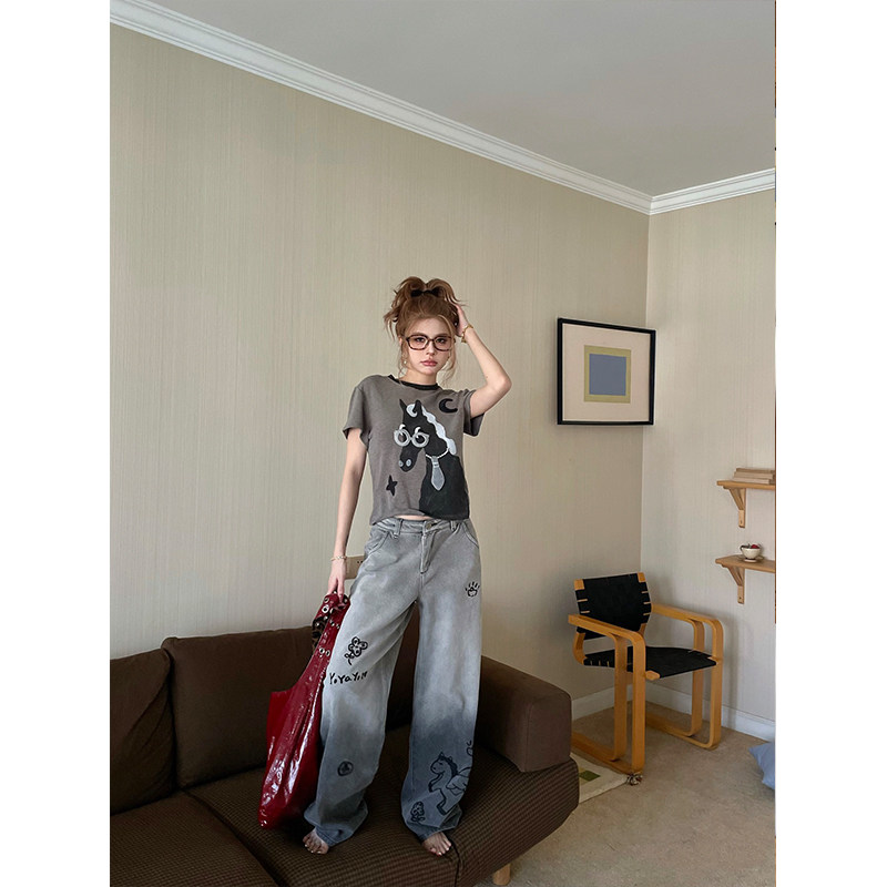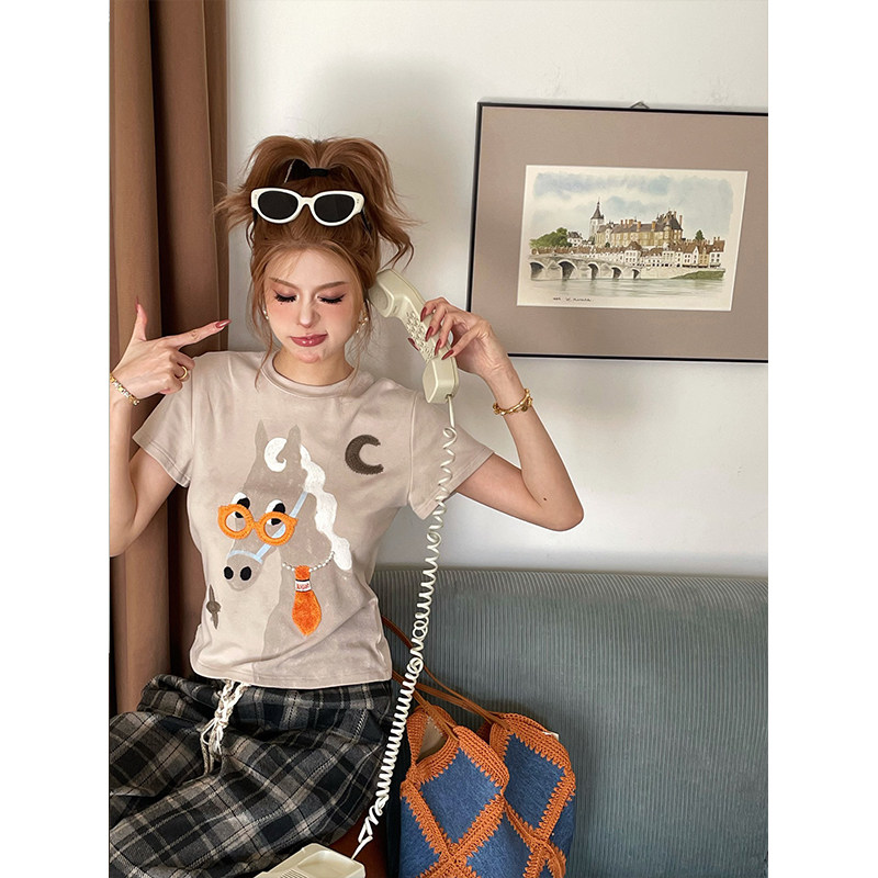 上衣T恤 显瘦短袖 skipsmile秋冬新款 趣味可爱立体小马卡通图案修身