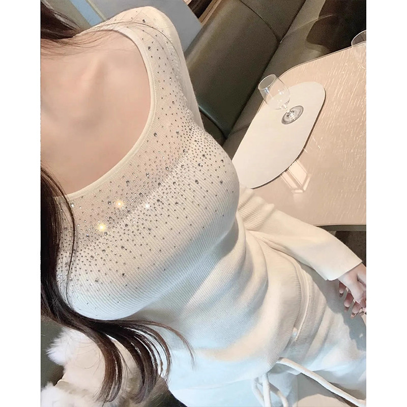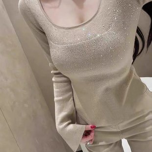 女秋冬气质超好看高级感内搭上衣 针织衫 已到货 纯欲U领烫钻长袖