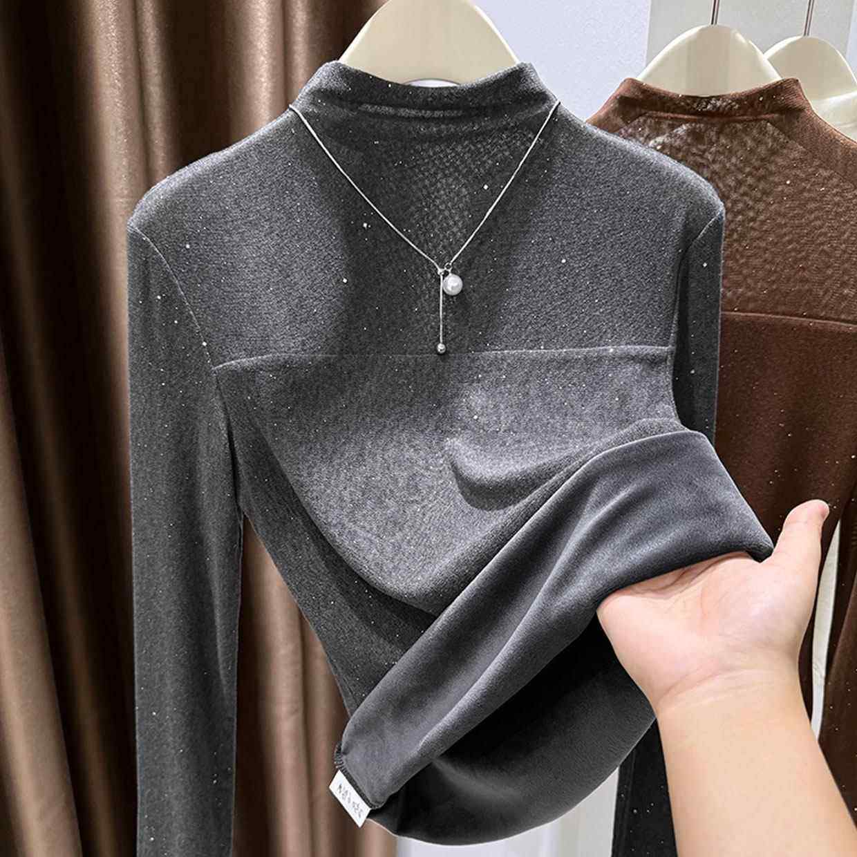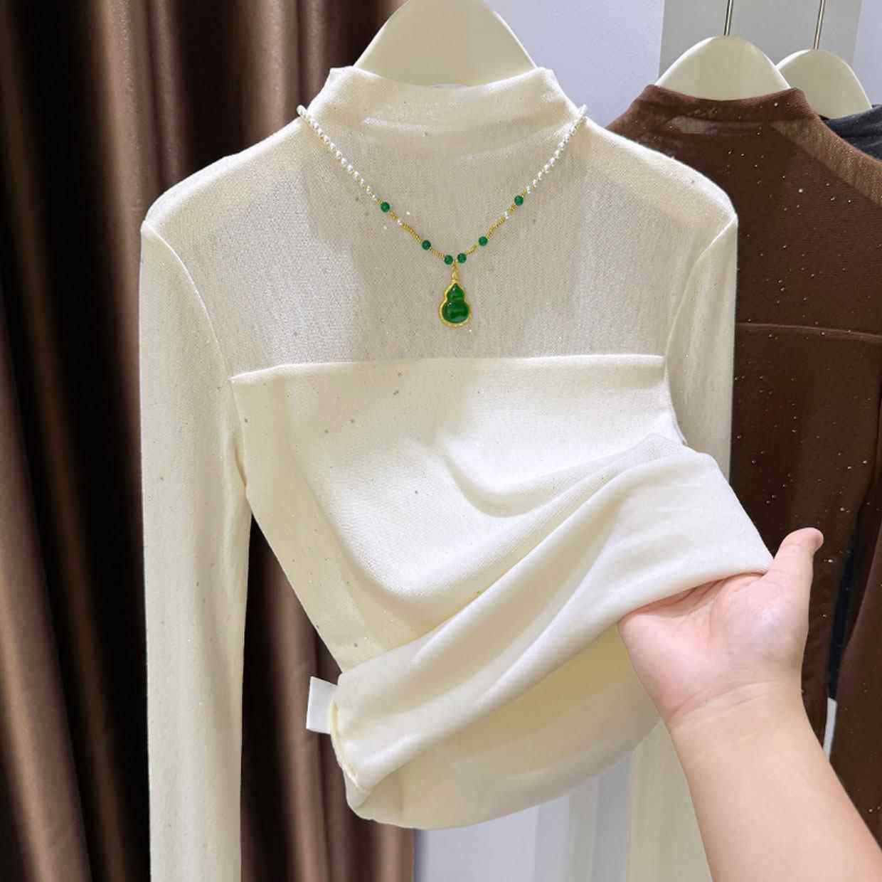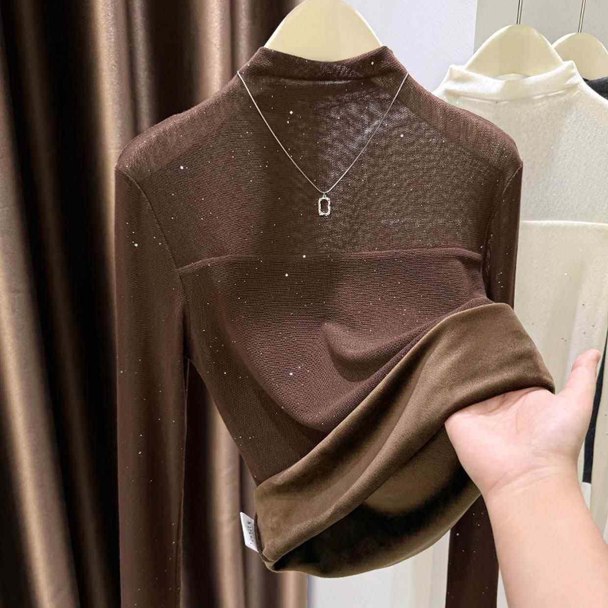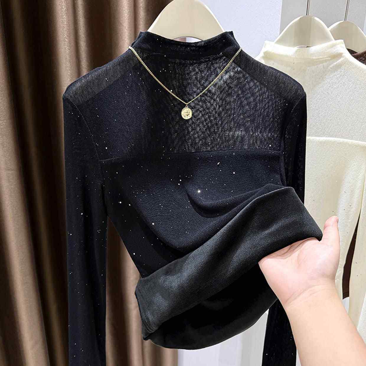 长袖 加绒加厚内搭修身 蕾丝1219e 女秋冬季 高领网纱叠穿亮片打底衫