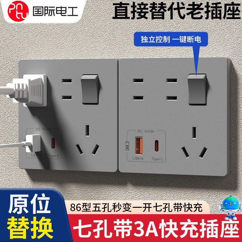 飞利浦86转换插座分控USB快充一转多功能多孔超薄无线带开关插座