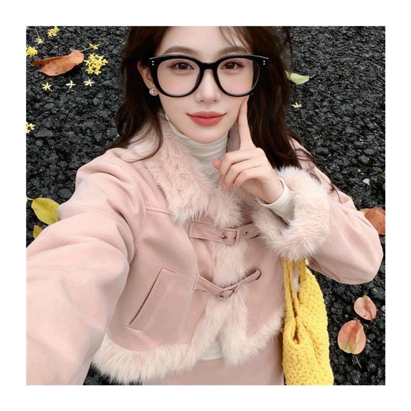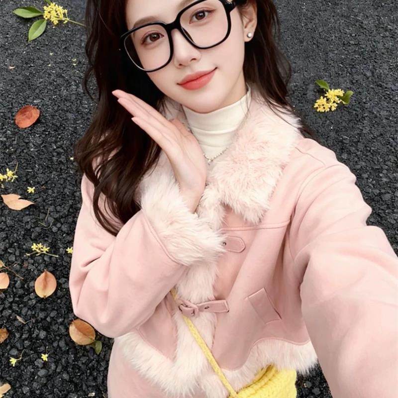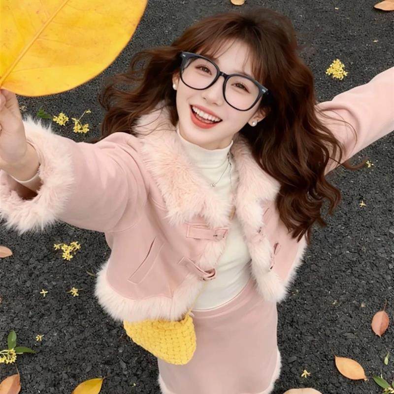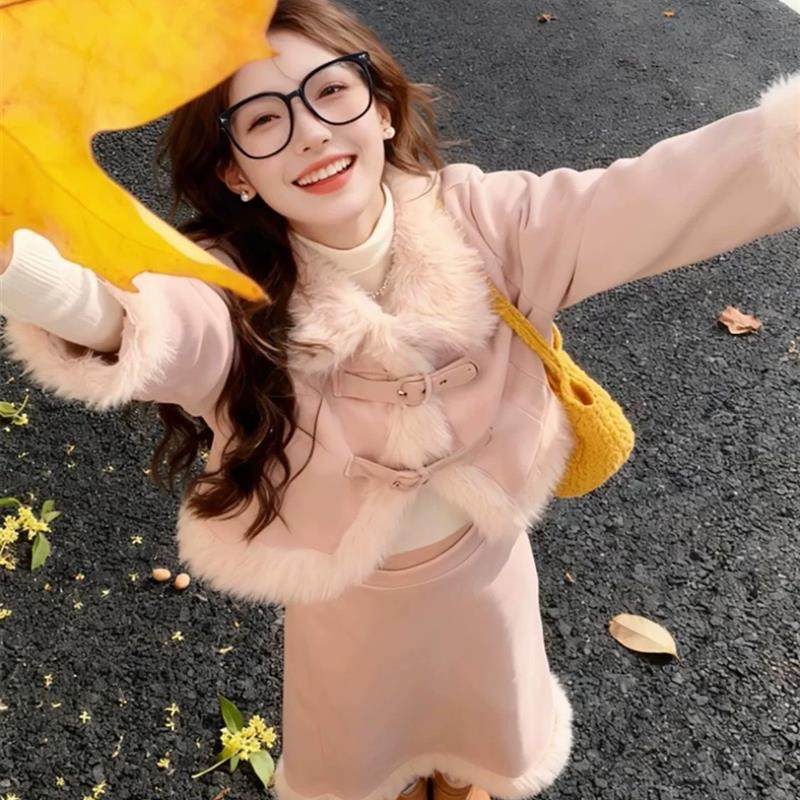 法式 裙秋冬夹棉保暖外套裙子两件套 高级名媛超仙绝美翻领粉色套装