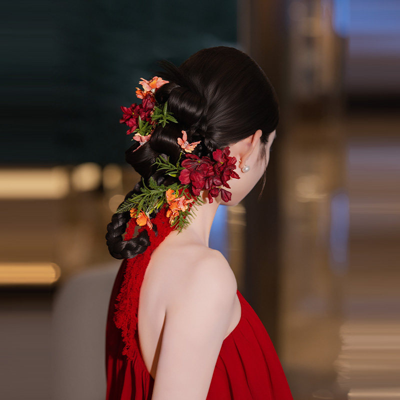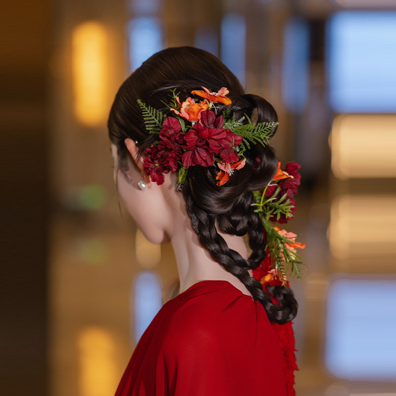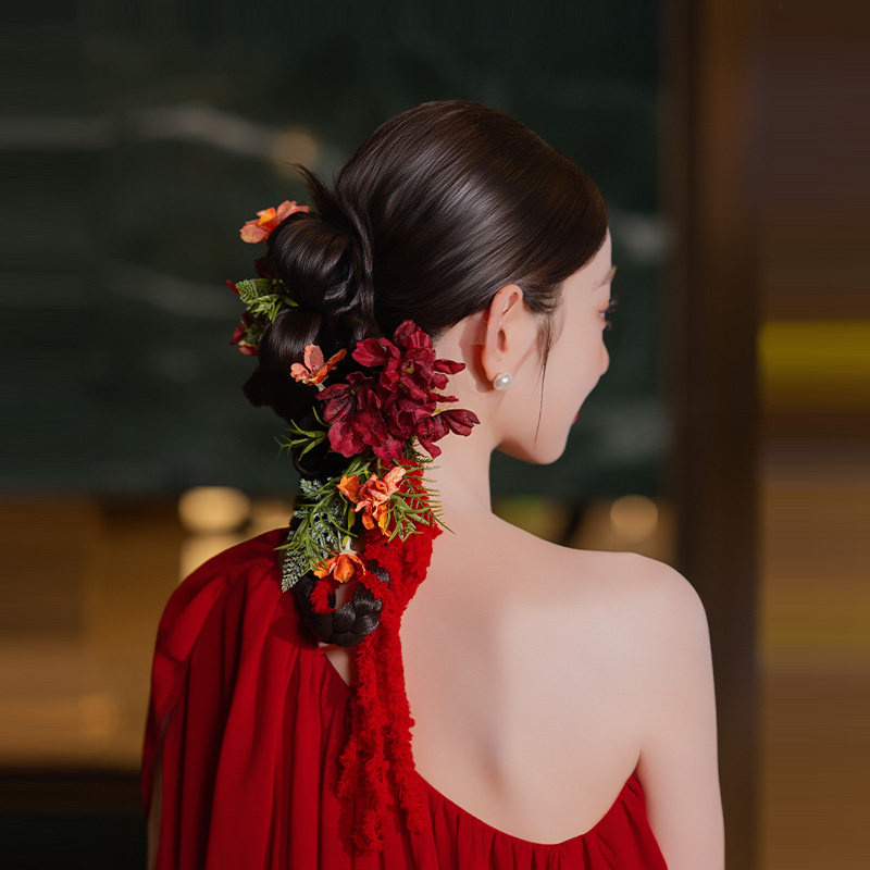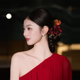国风新娘头饰手工复古仿真花朵毛绒线红色系发夹礼服旗袍裙发饰品