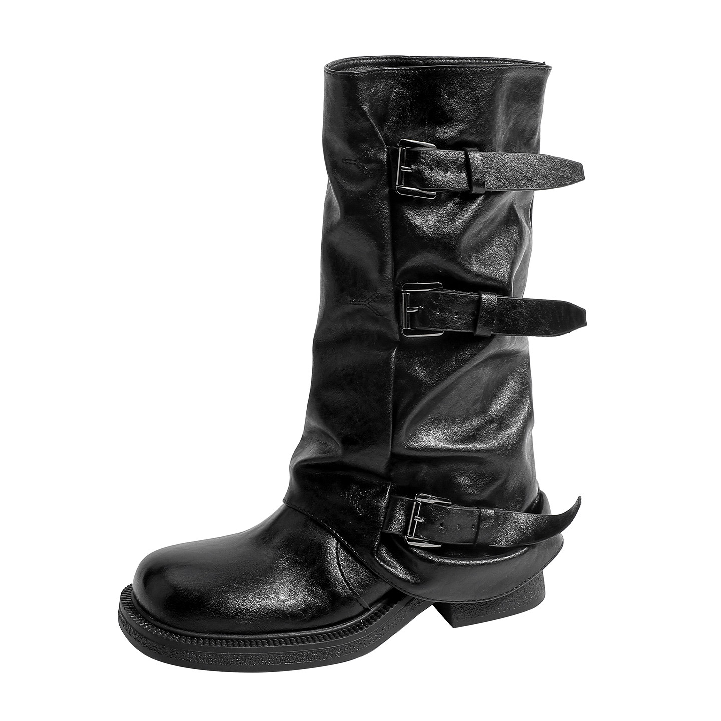 女靴 管靴女秋堆堆长筒靴西部牛仔骑士靴大码 真皮 厚底褶皱中筒裤