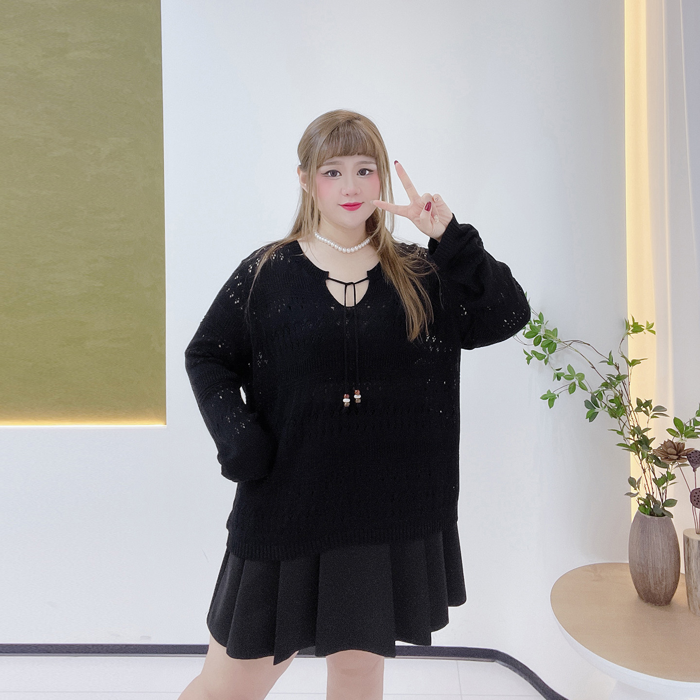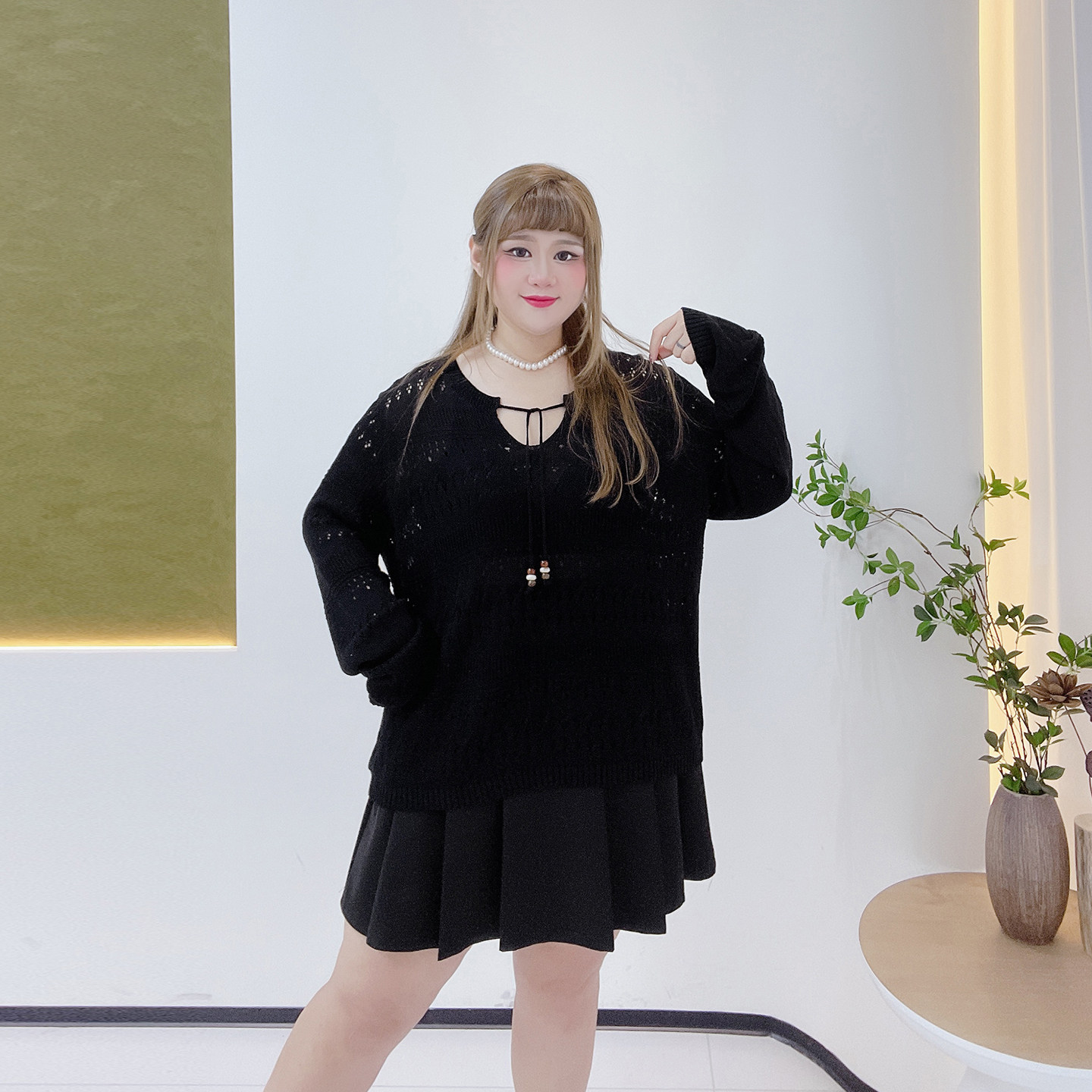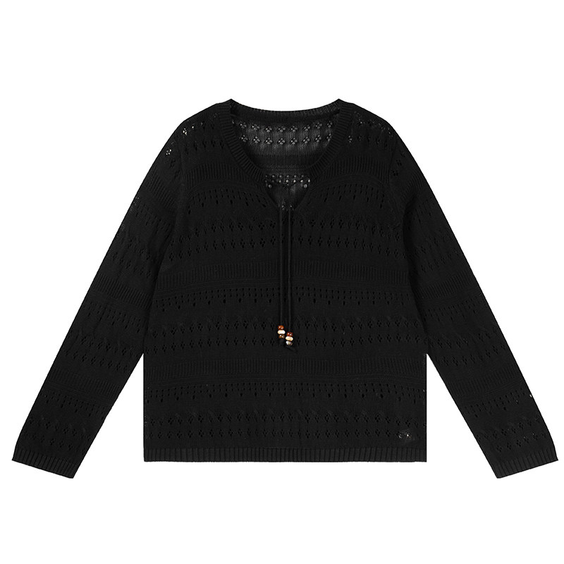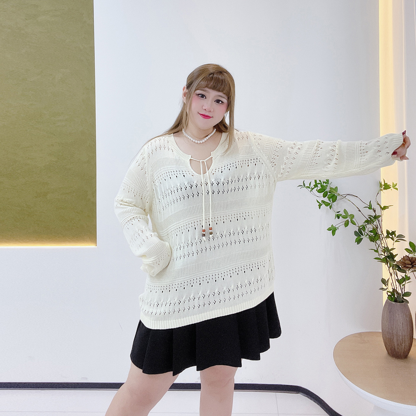 春甜美软糯系带针织衫 女装 胖莹莹大码 温柔风梨形身材显瘦镂空罩衫
