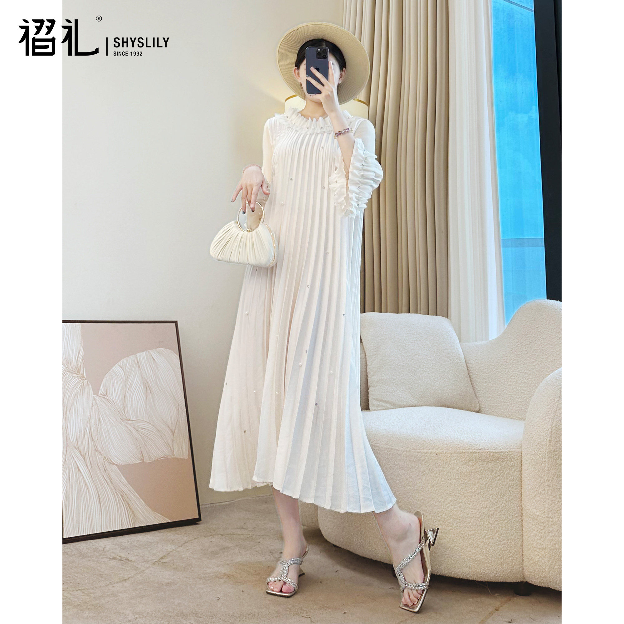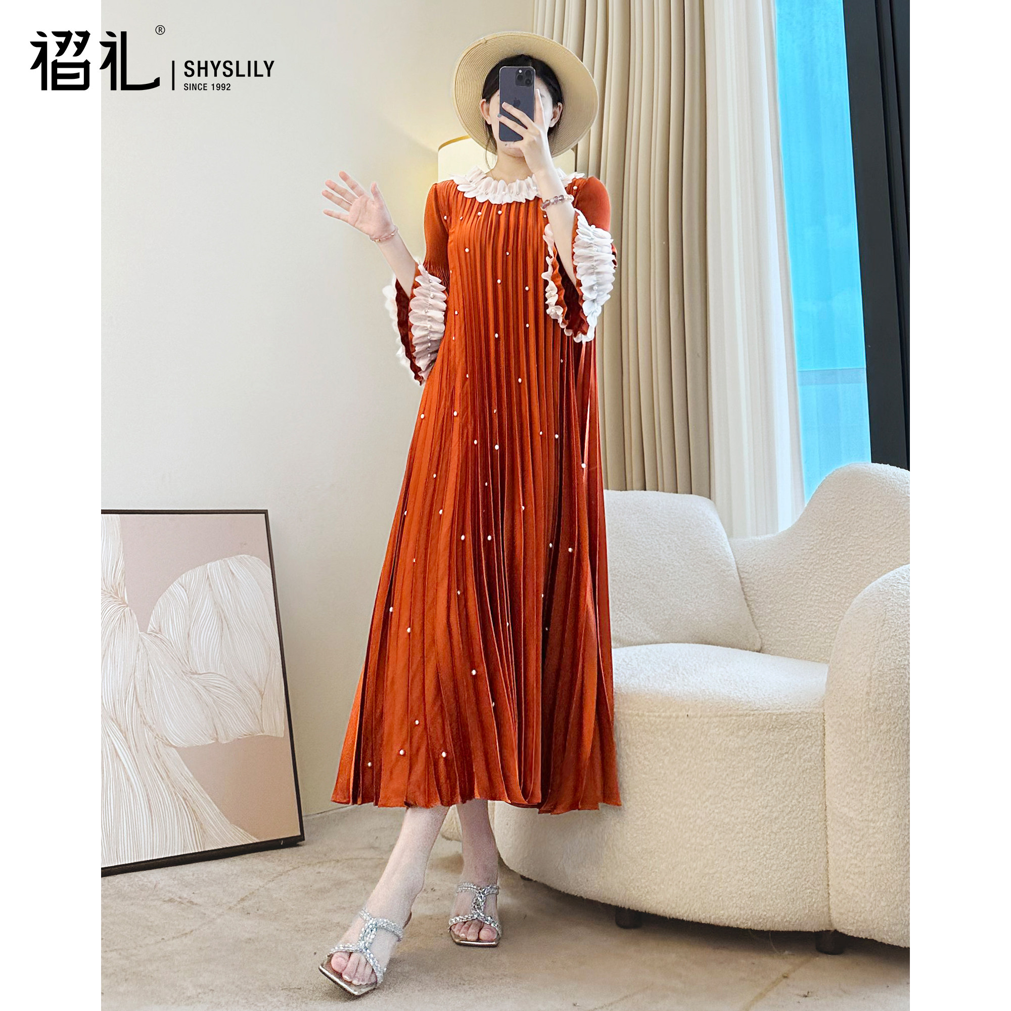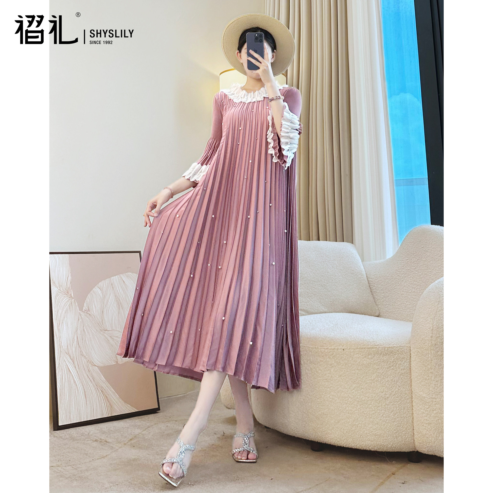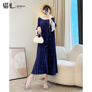 三宅褶皱高级感黑色连衣裙女春装 气质赫本风长裙 高端胖mm洋气大码