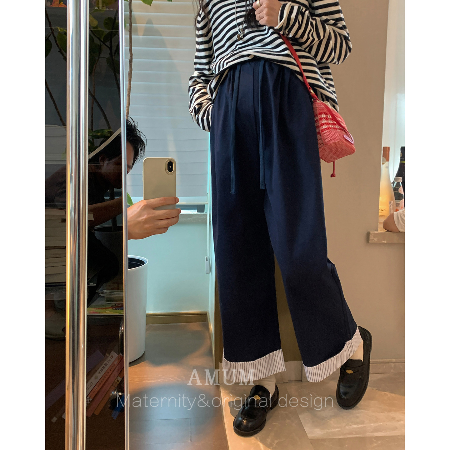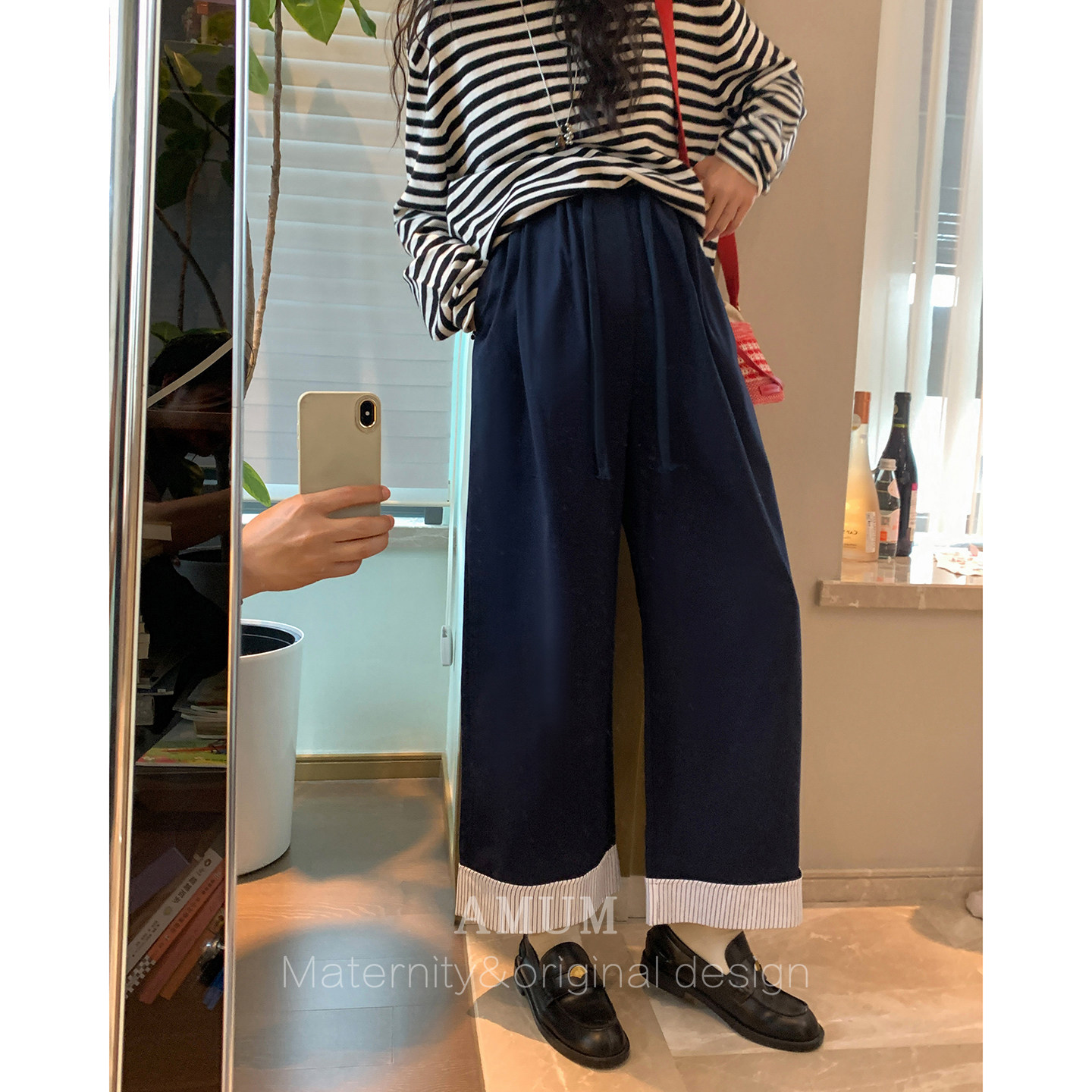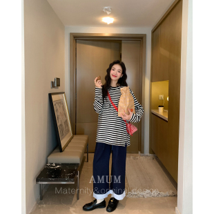 梨形遮肉可调节裤 条纹卷边撞色阔腿裤 日常通勤 子 AMUM孕妇装