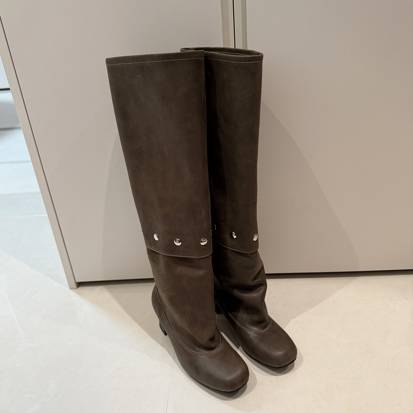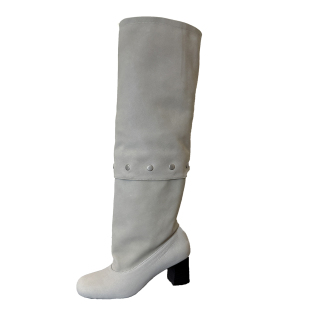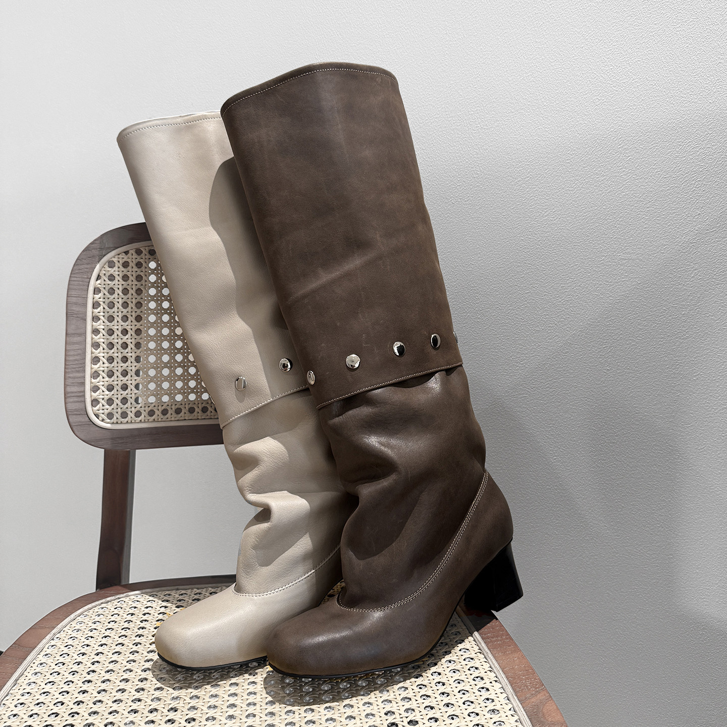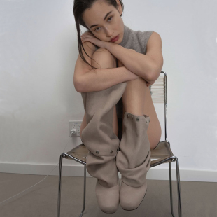 wool长靴复古粗跟拼接褶皱堆堆裤 paloma 管靴牛仔靴 皮风格 圆版