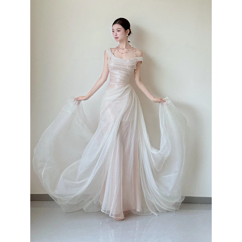吊带缎面晚礼服2025新款 订婚领证轻婚纱小白裙生日显瘦艺考演出服