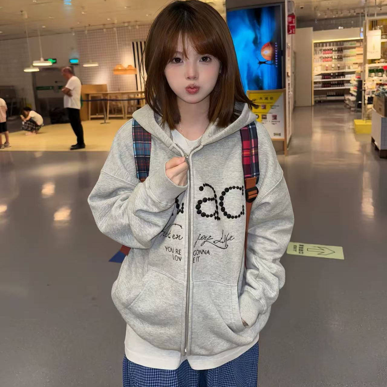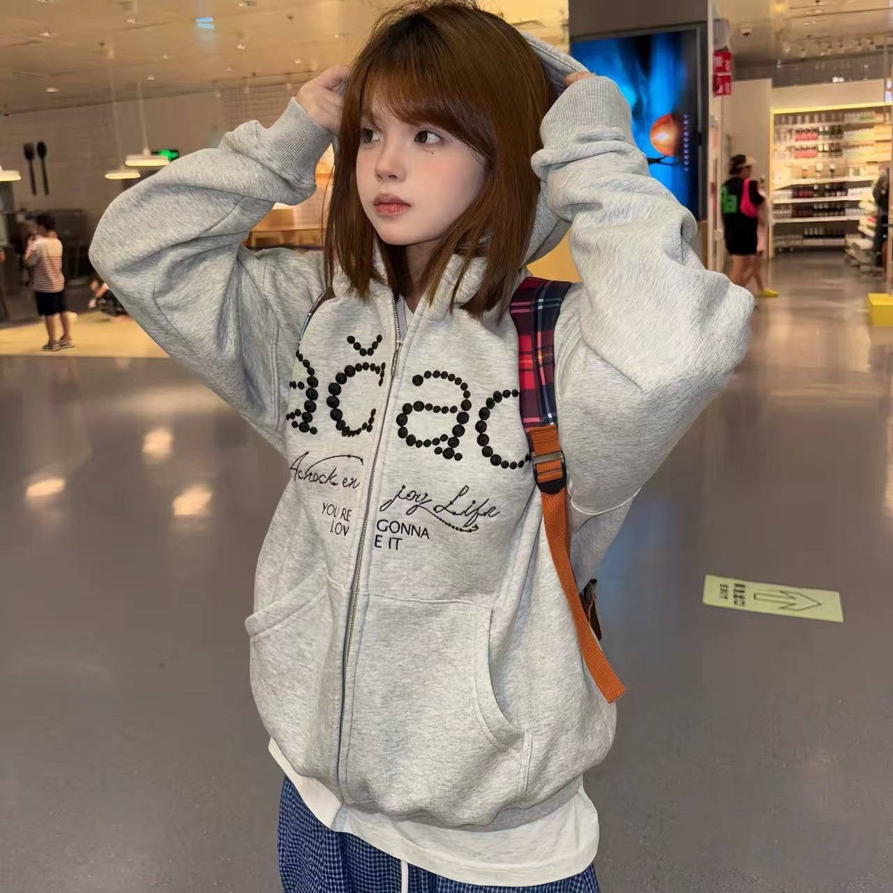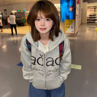 灰色立体刺绣字母连帽拉链外套女秋冬季 独特慵懒潮牌情侣卫衣 开衫