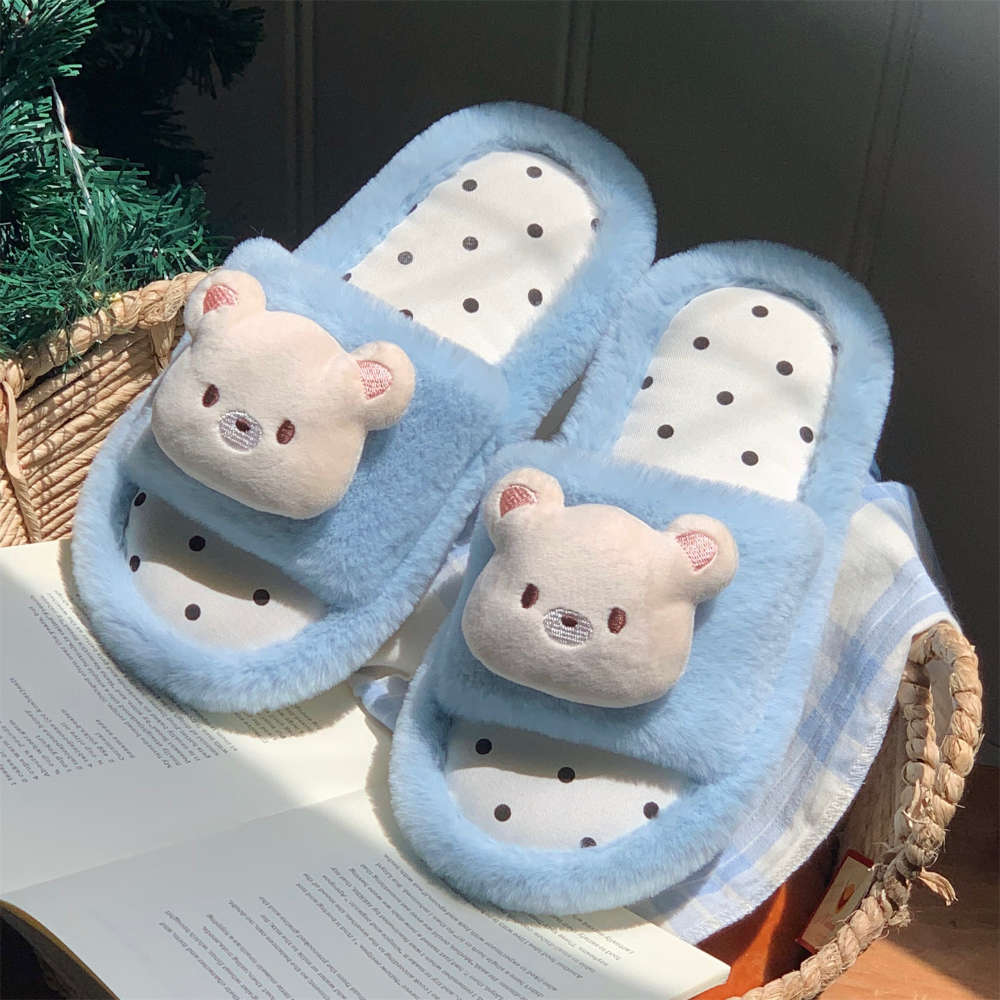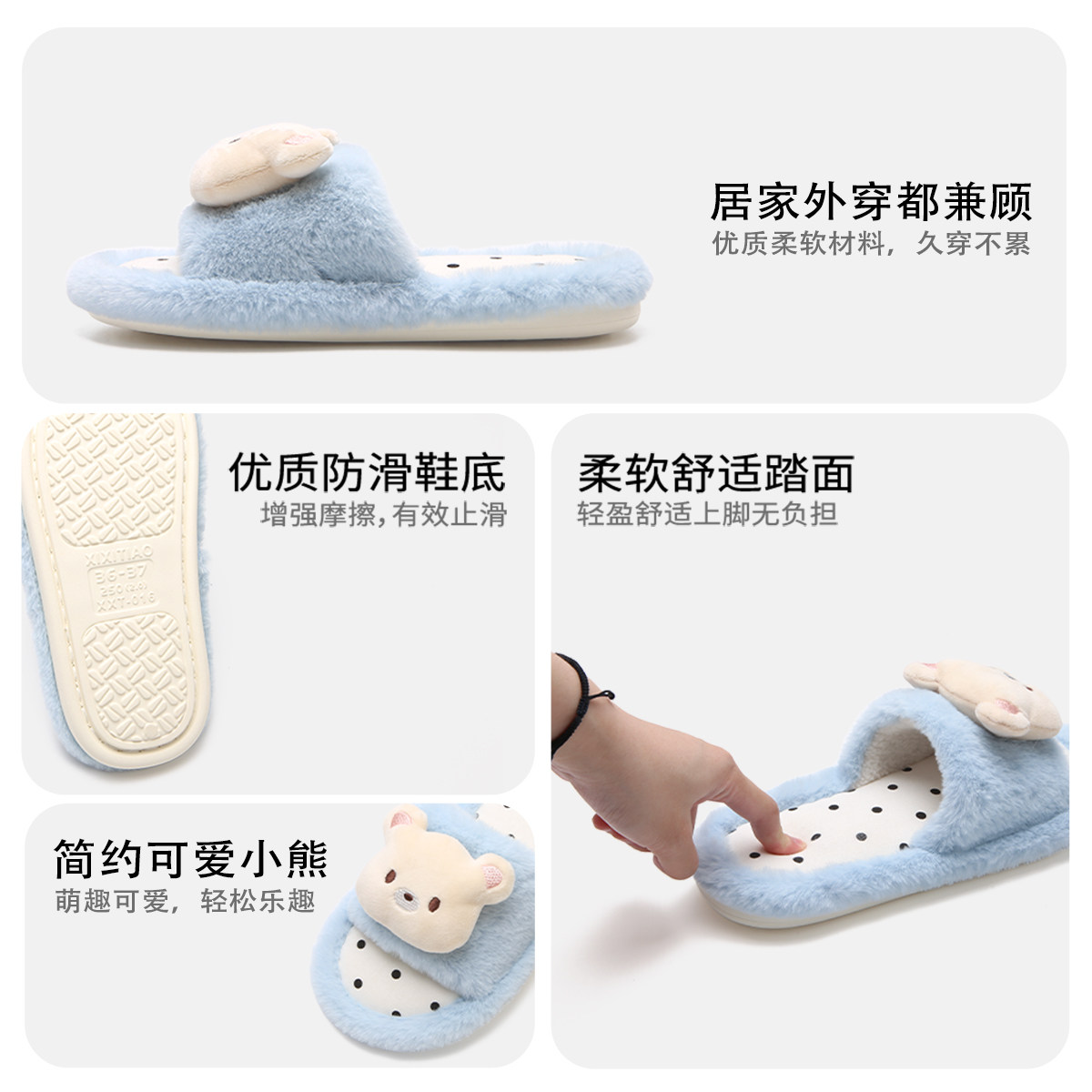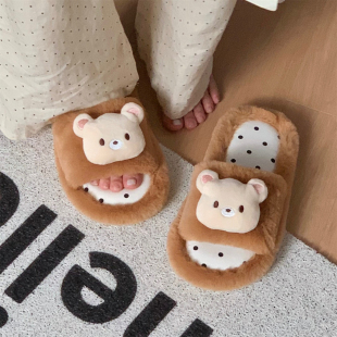 ins 女软萌波点小熊秋冬防滑家居一字棉拖鞋 细细条 少女心毛毛拖鞋