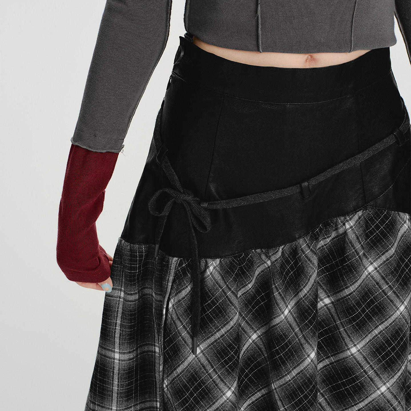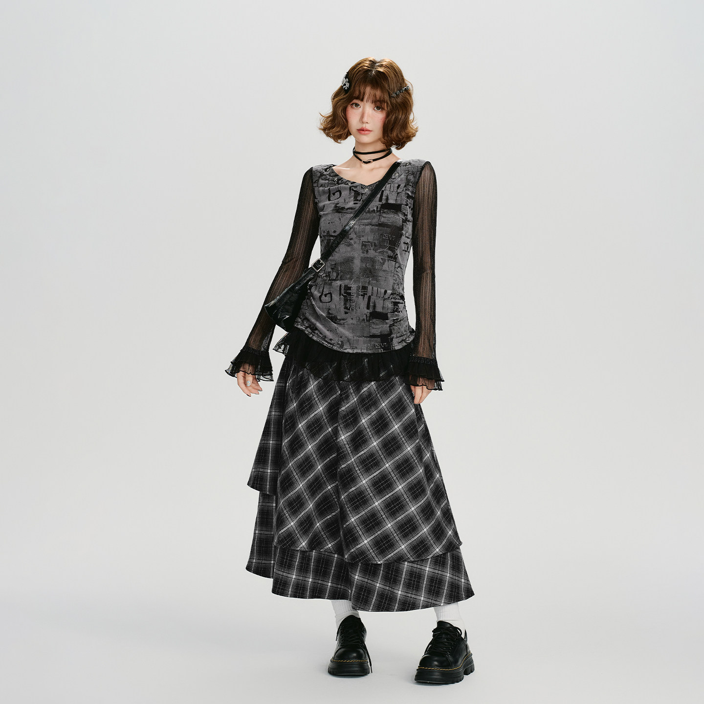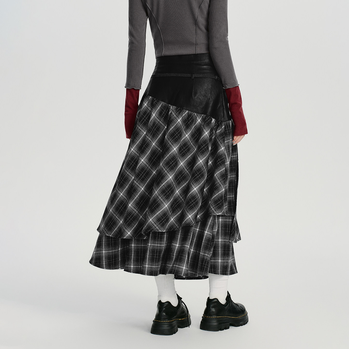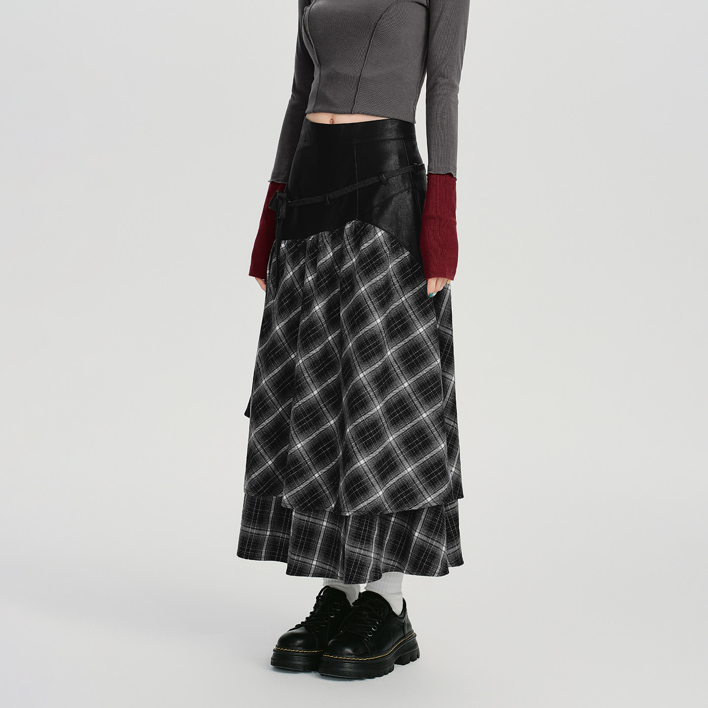 Girlyhalo美式 宽松a字长裙 复古设计感双层拼接格纹半身裙女秋新款