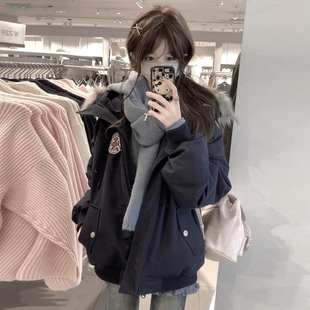 慵懒风派克服棉服 藏青色复古加厚夹棉连帽外套女胖mm美式 大码 女装