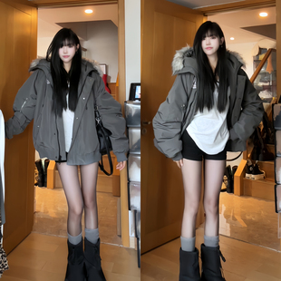 棉服女美式 胖mm黑色工装 复古派克服加厚大毛领外套 女装 300斤大码