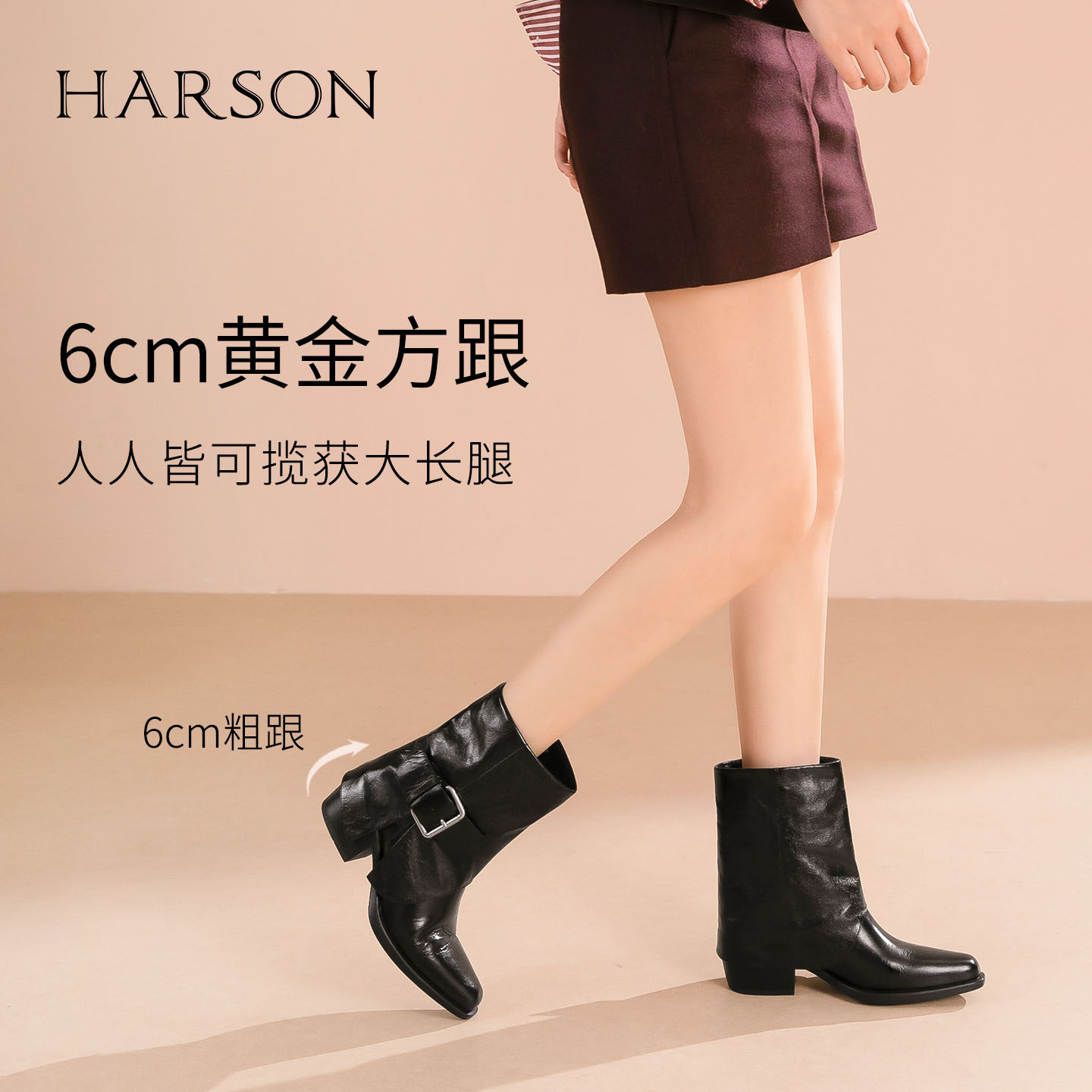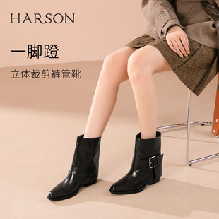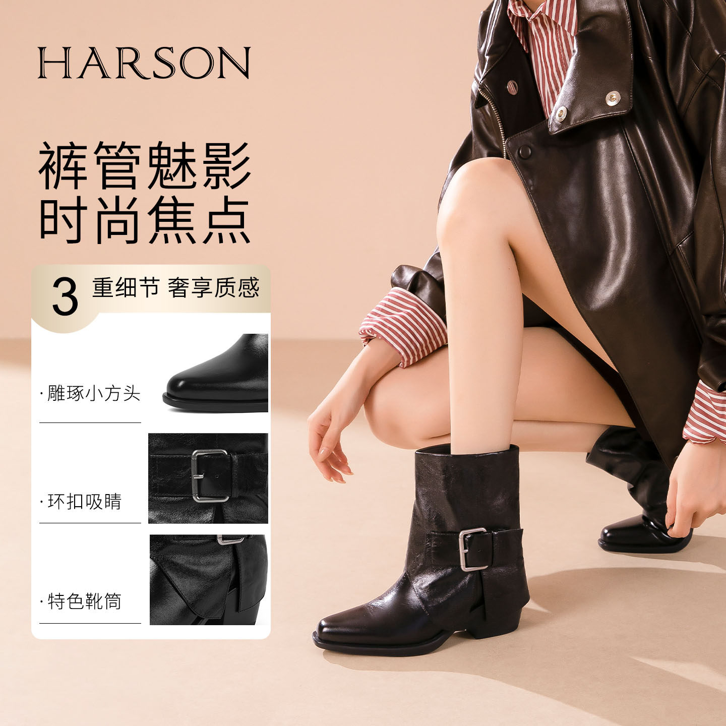 HARSON 复古真皮粗高跟时装 裤 25冬新款 靴中筒靴女 管魅影 哈森