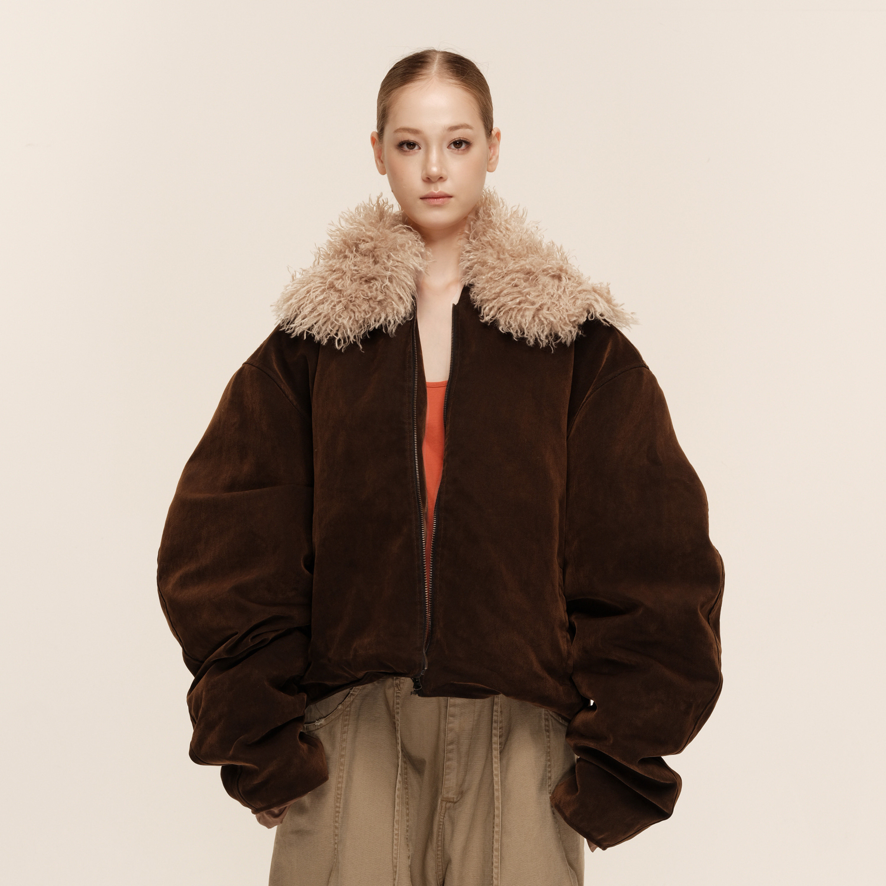 COZYDOLL斯拉夫风白鸭绒复古水洗抽褶廓形可拆卸毛领派克羽绒服女