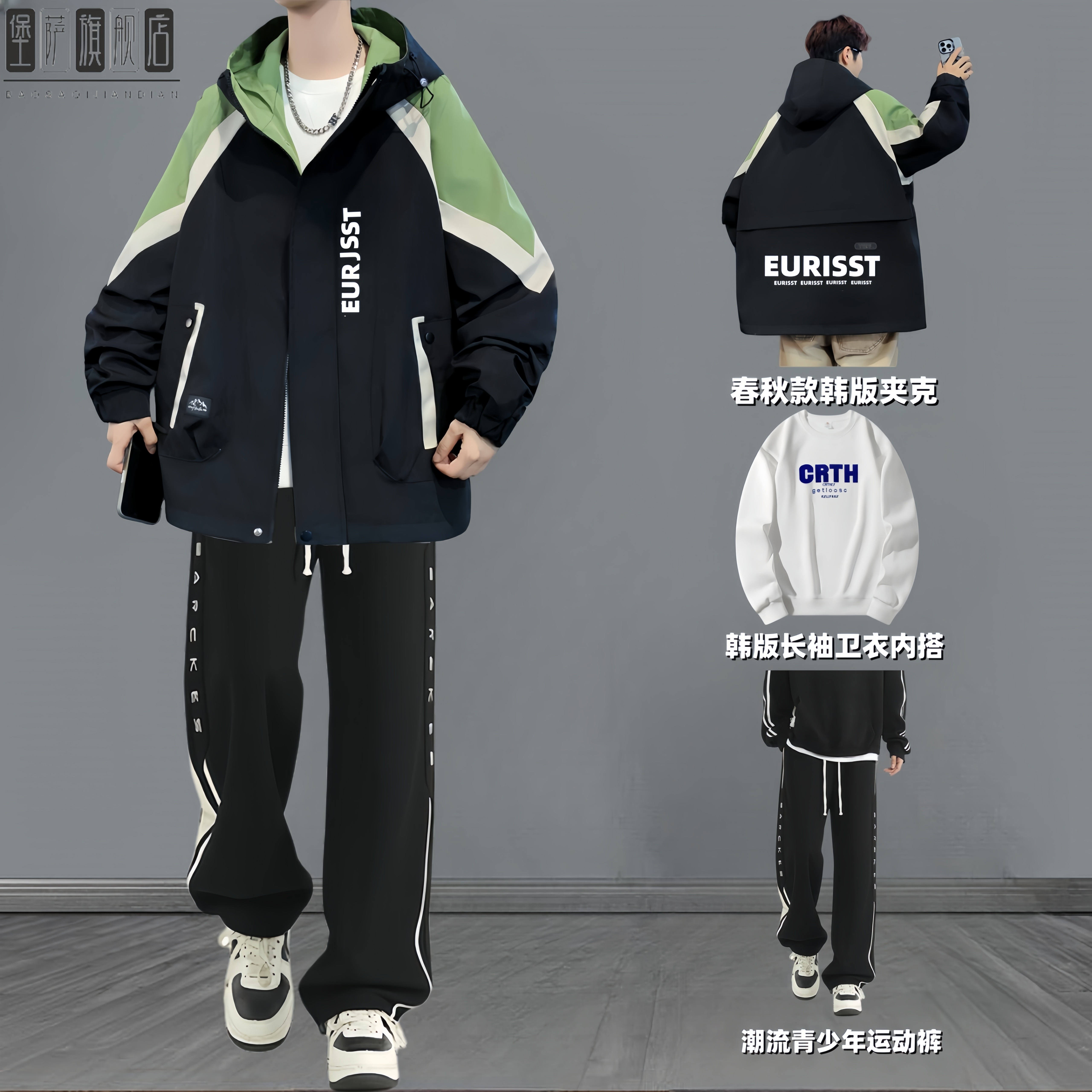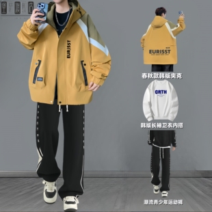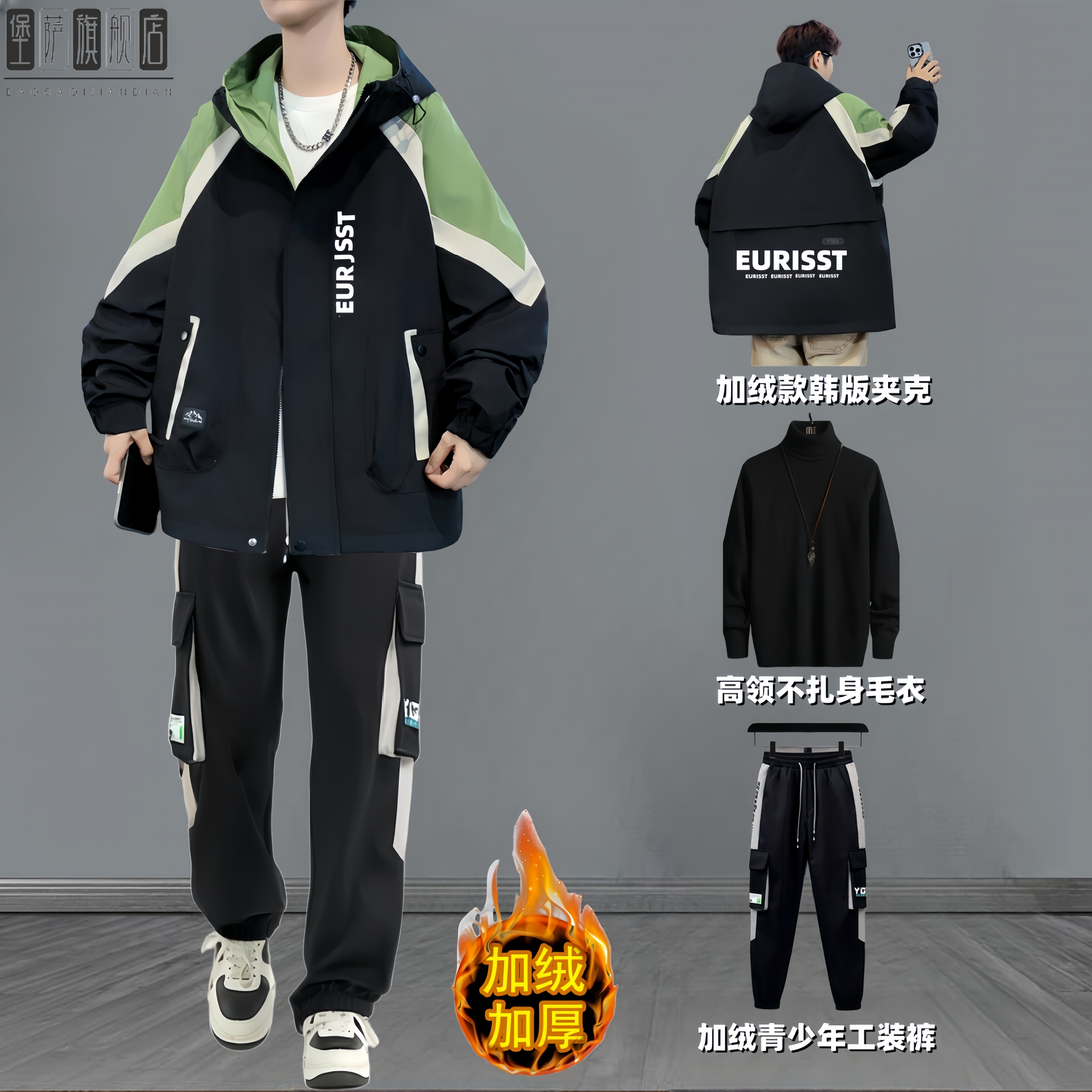 青少年连帽男生夹克2025春秋冬季 港风潮流大童冲锋衣加绒外套 新款