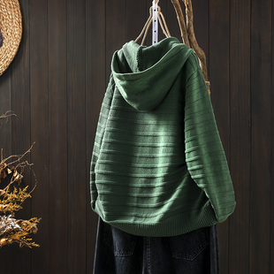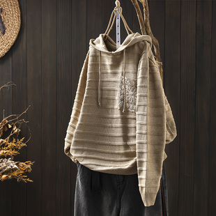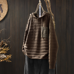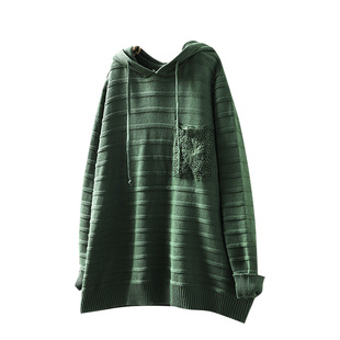 条纹蕾丝保暖针织衫 宽松连帽毛衣女文艺显瘦长袖 套头上衣 新款 秋季