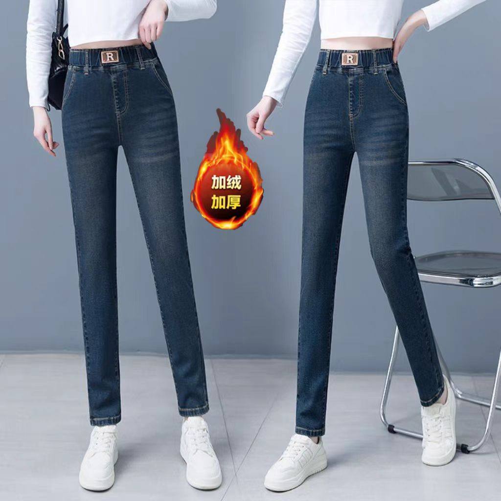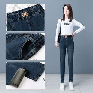 女秋冬高腰显瘦弹力铅笔裤 加绒加厚牛仔裤 松紧腰小脚单裤 2025新款
