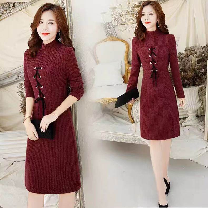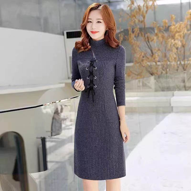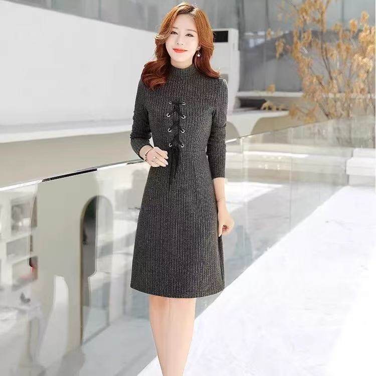正肩喇叭袖 微胖mm冬季 仿羊绒针织打底连衣裙 百分百女装 DM100大码