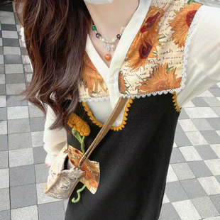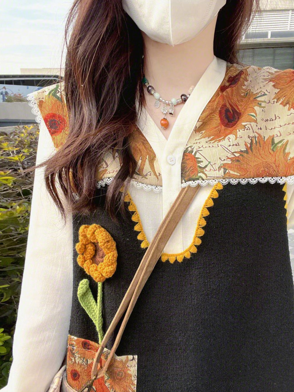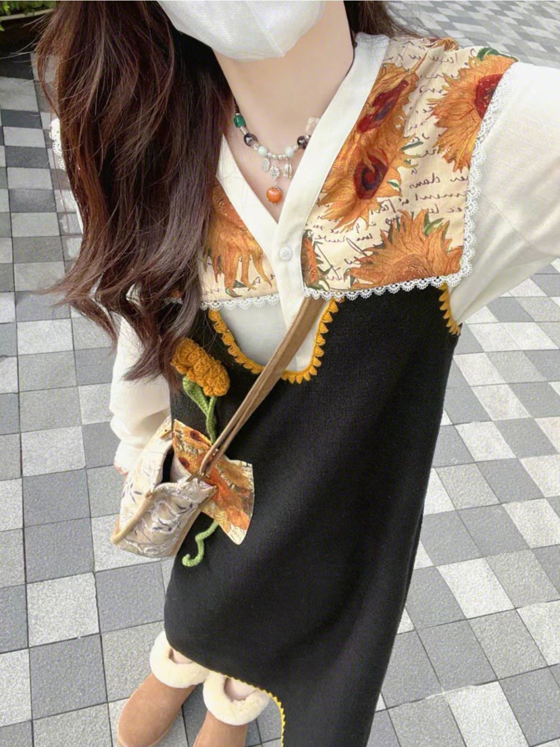 梵高向日葵学院背心裙两件套 2025早秋艺术生穿搭V领衬衫 大码 女装