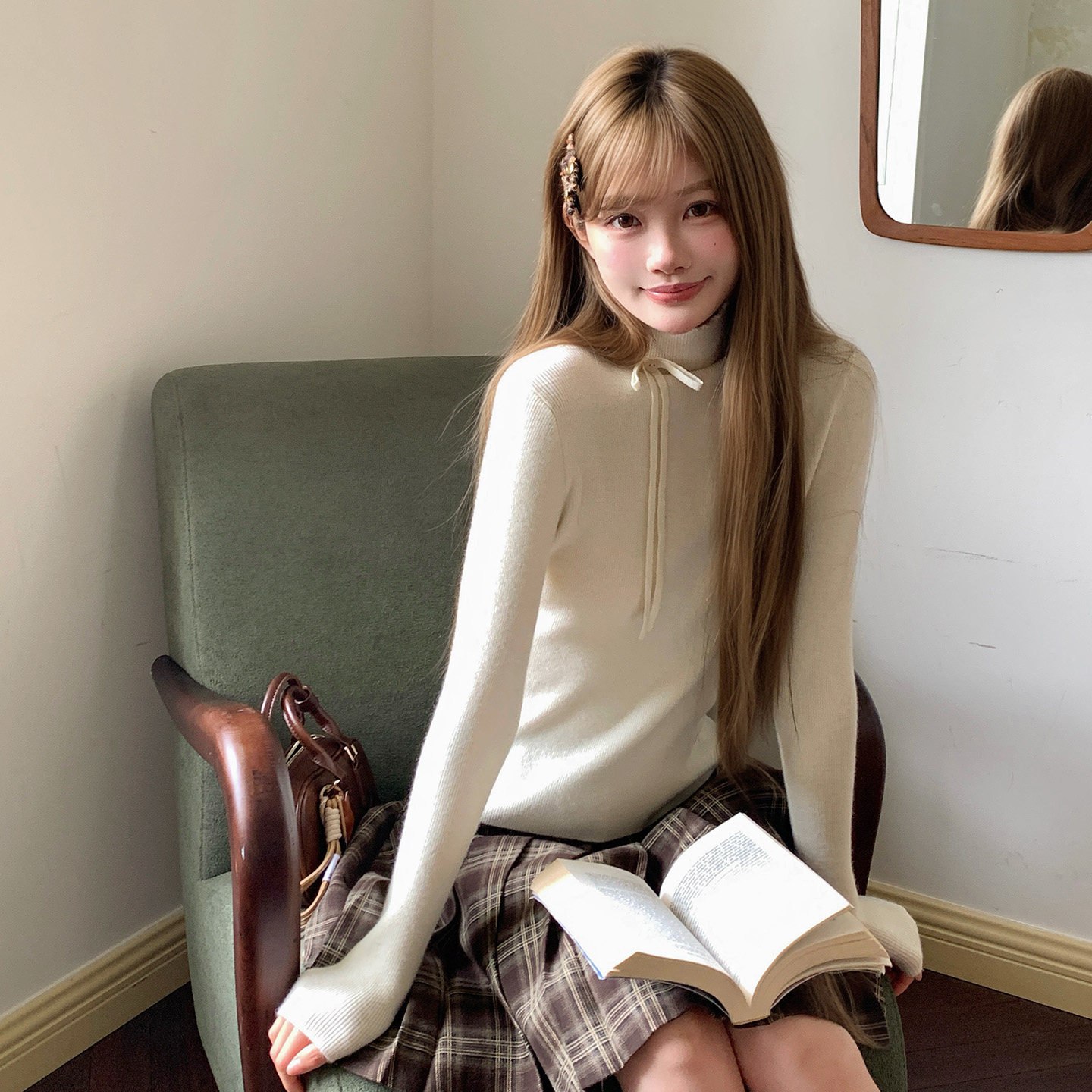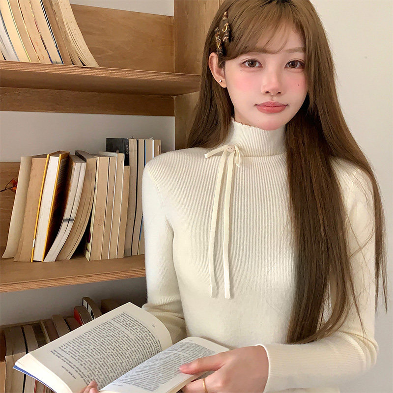 东京岁时记jk秋冬打底内搭米白色蝴蝶结毛衣修身 高领针织上衣女