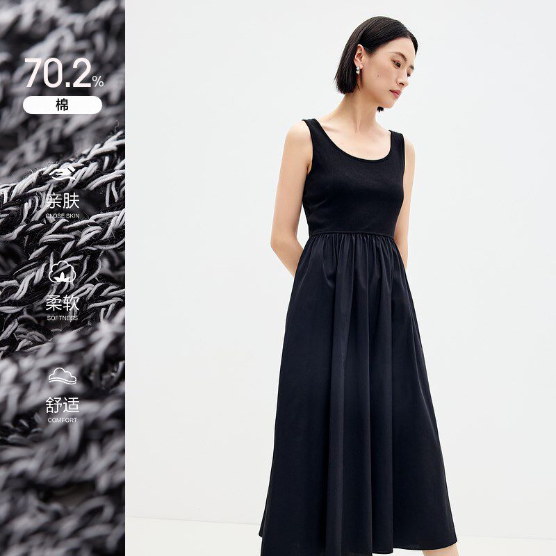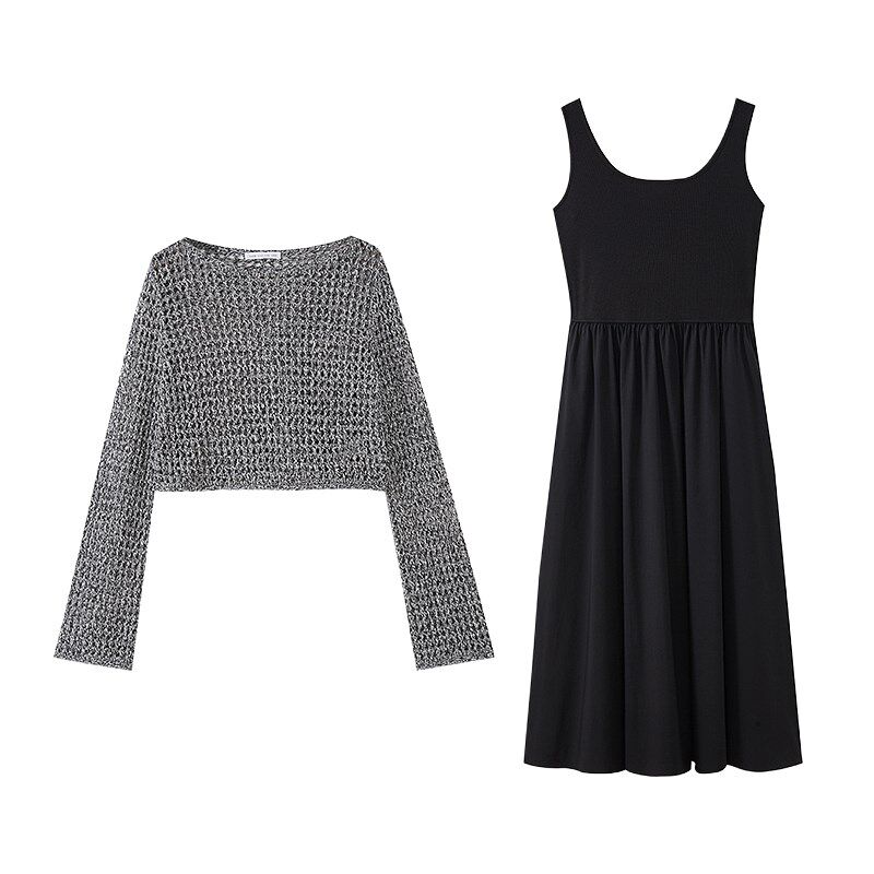 裙2025春新款 水云间连衣裙镂空针织衫 黑色吊带背心长裙女两件套装