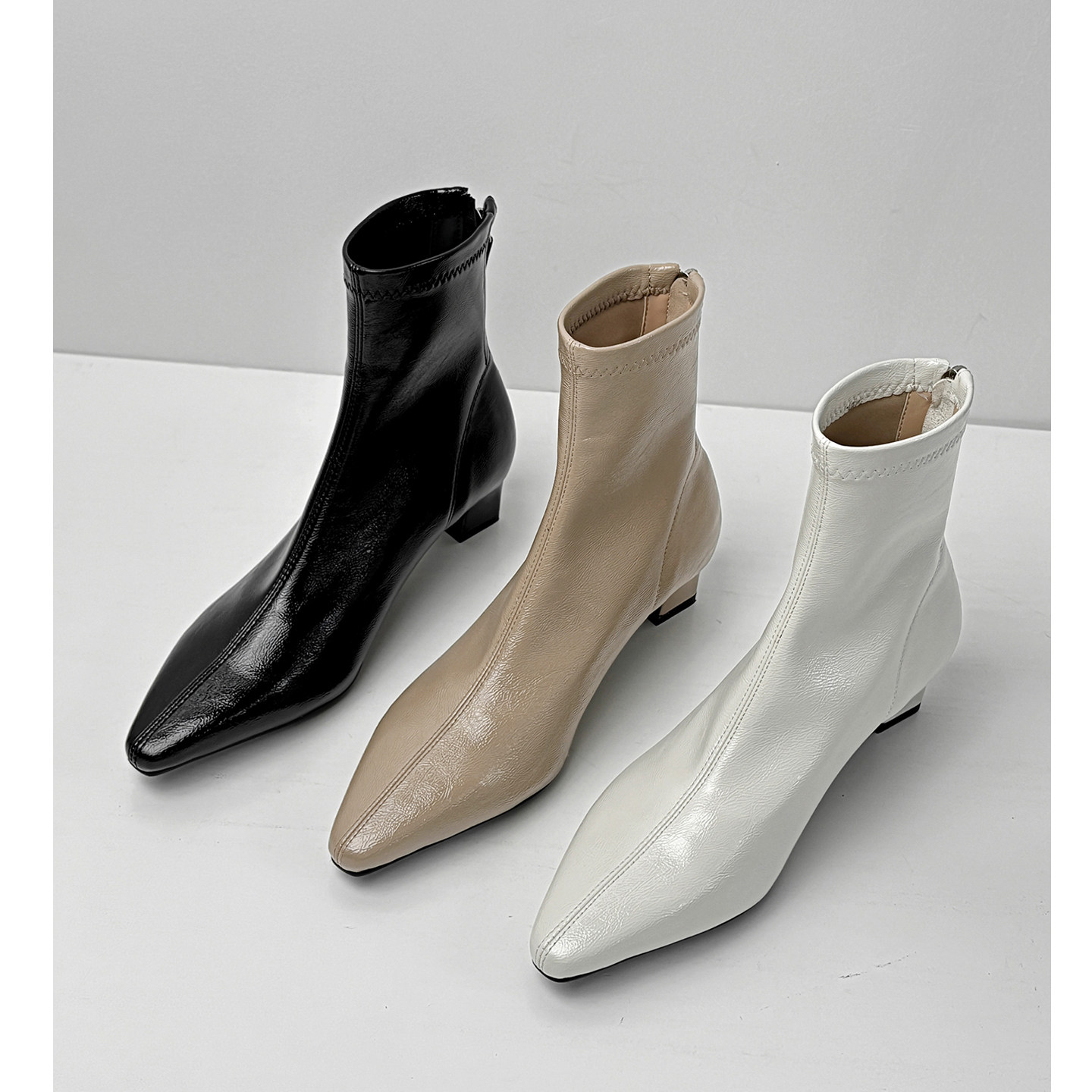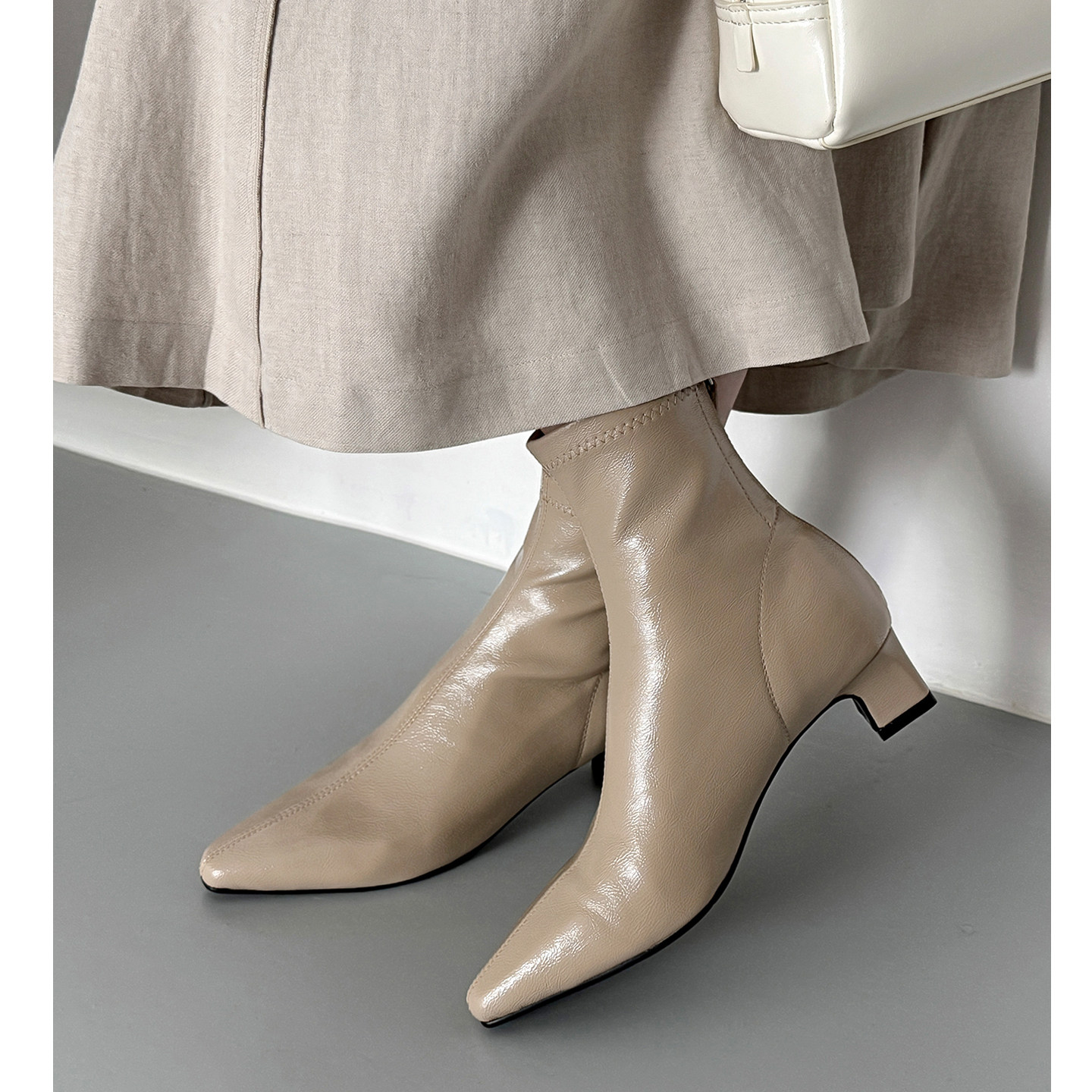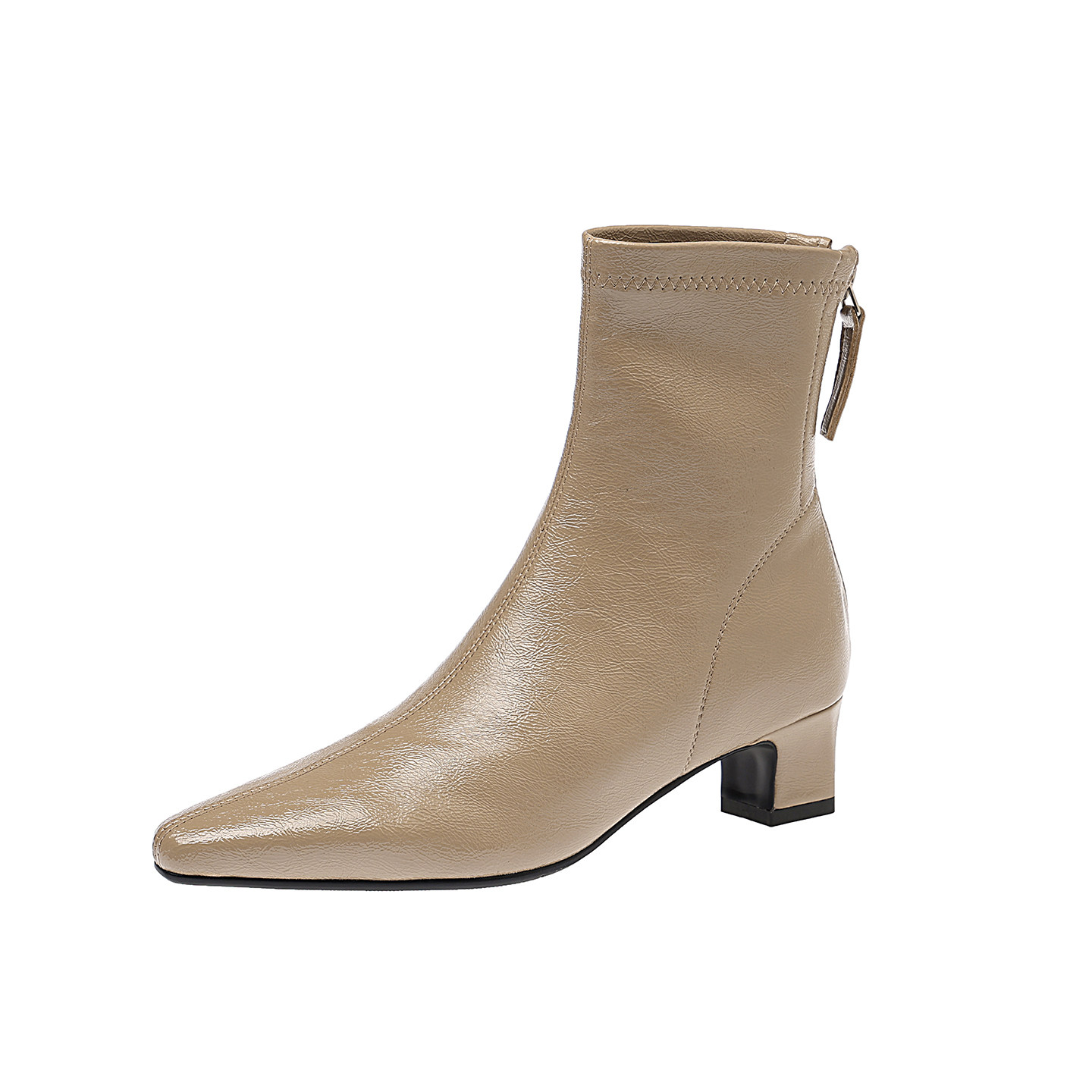 Kmeizu巨显瘦 靴配大衣 浅色4cm粗跟短靴女秋冬弹力靴方头及踝时装