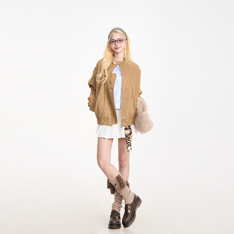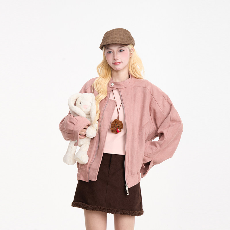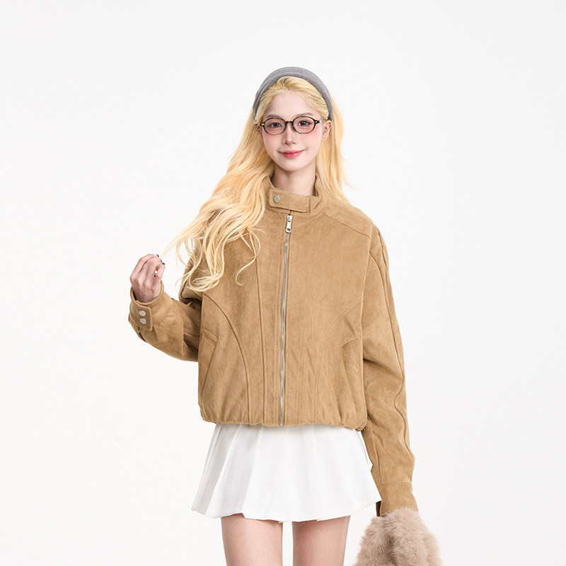 NERESUM美式 外套 复古麂皮绒立领夹克女秋冬设计感双拉链宽松工装