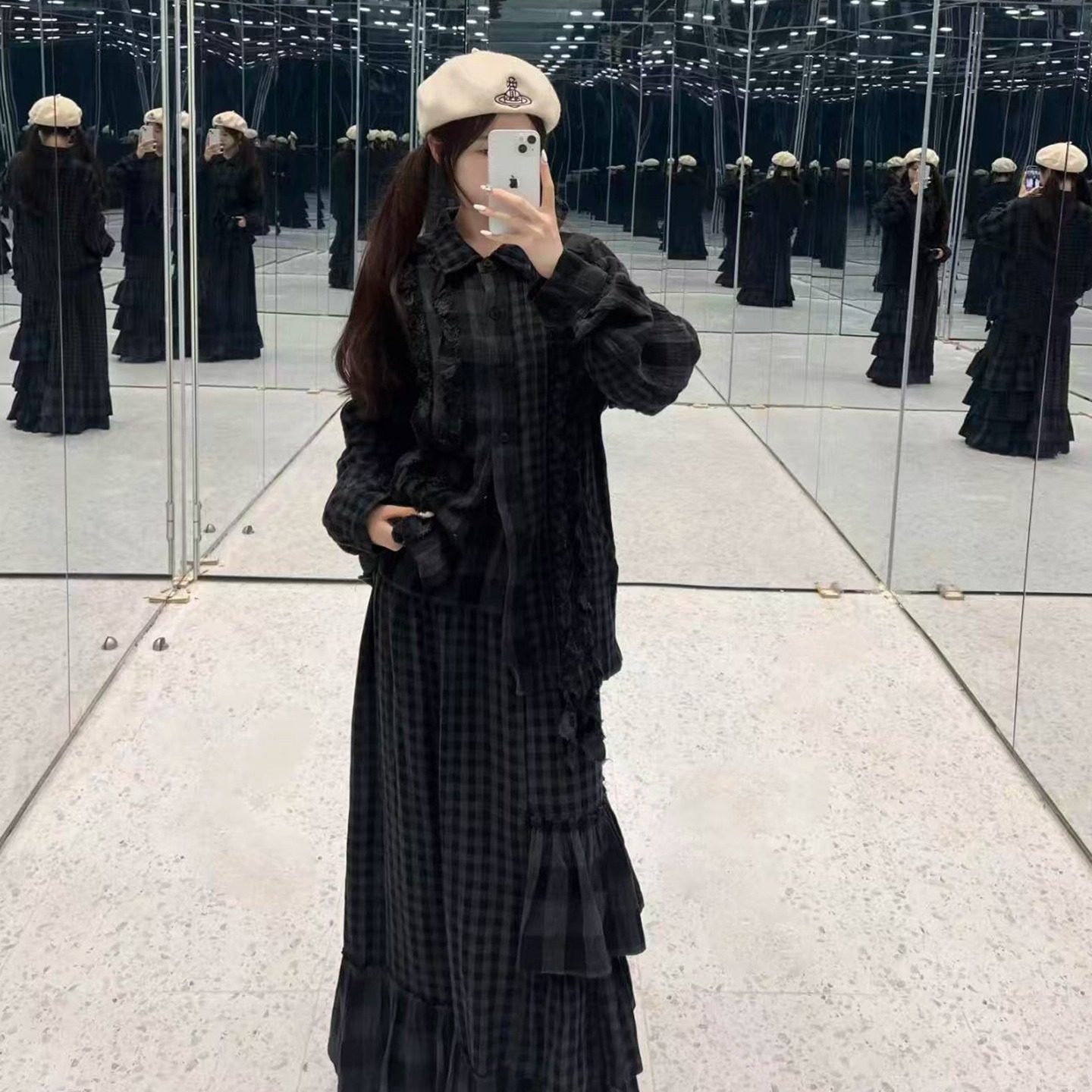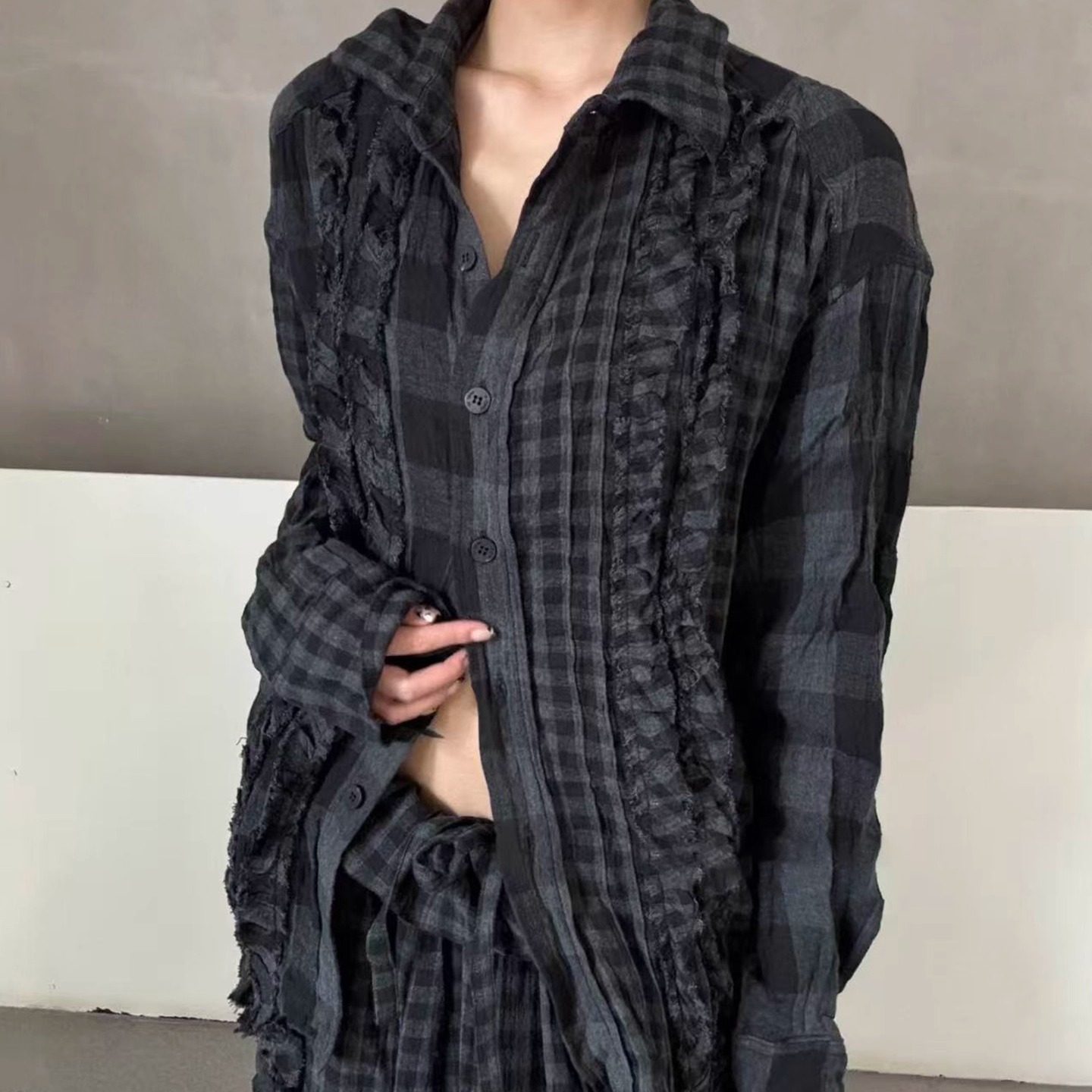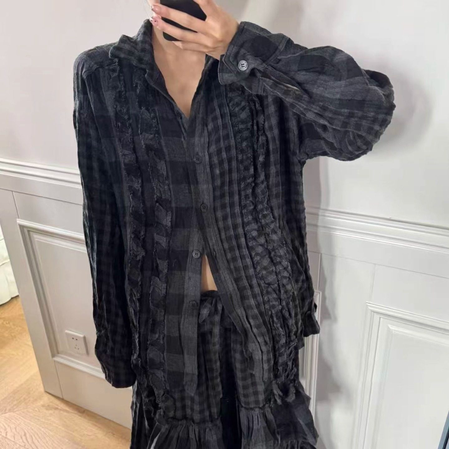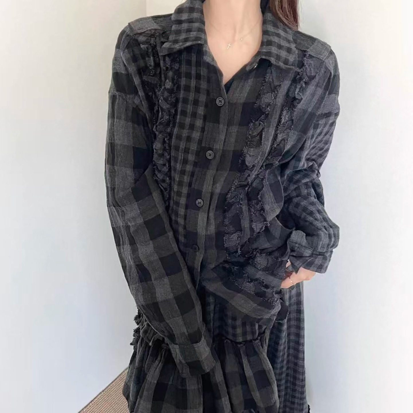 上衣 yy褶皱荷叶边复古格纹长袖 open出格校规风设计感磨毛衬衫
