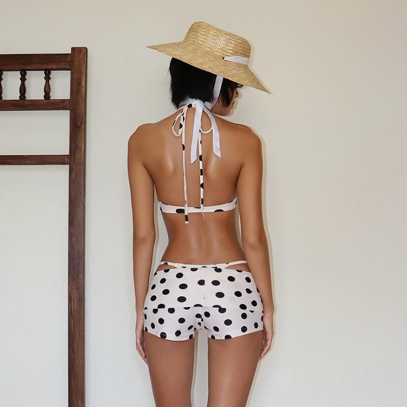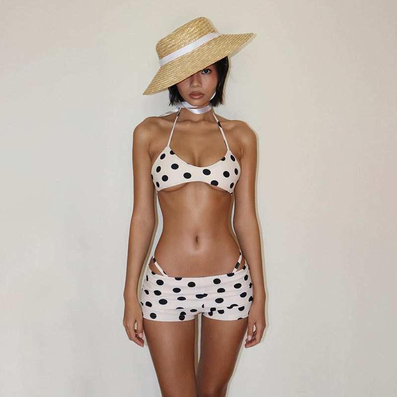 欧美假日波点比基尼纯欲挂脖绑带泳衣女款 性感辣妹风沙滩度假泳装