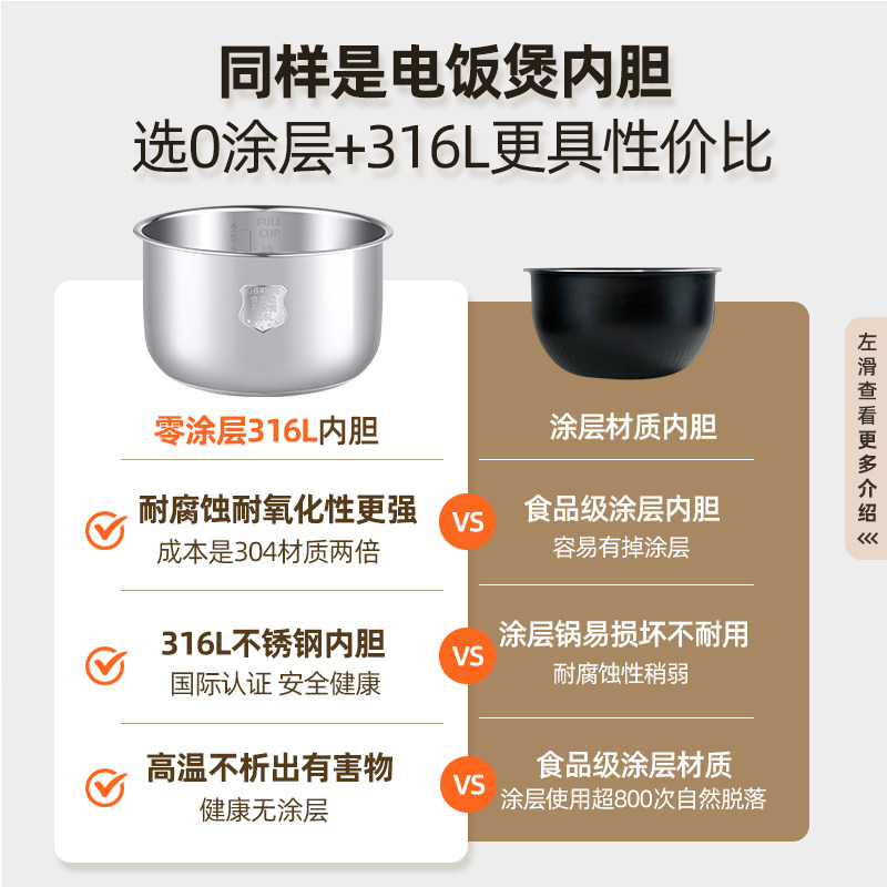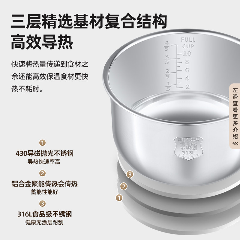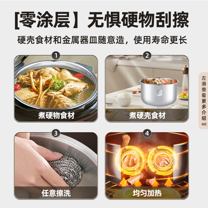 美 0涂层电饭煲家用4L多功能316不锈钢不粘内胆无涂层低糖电饭锅