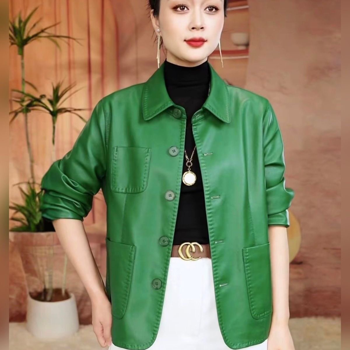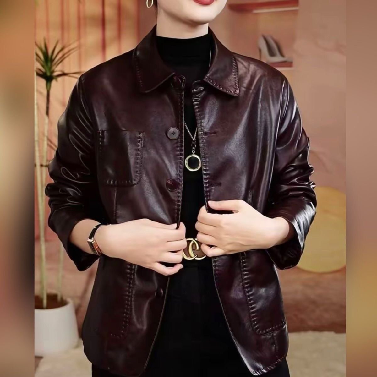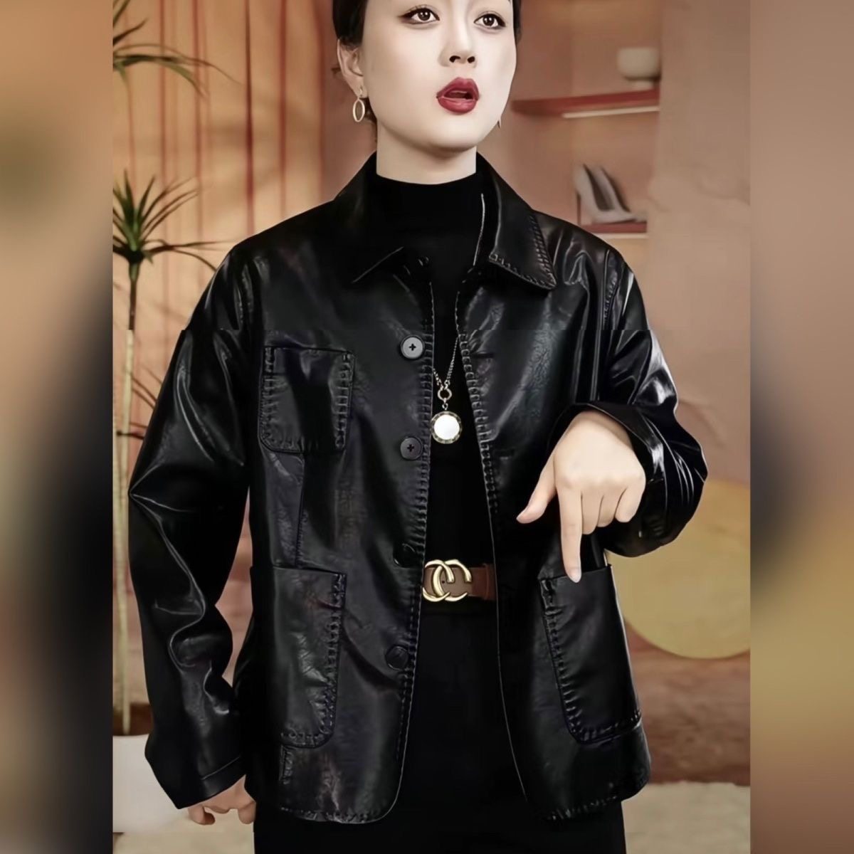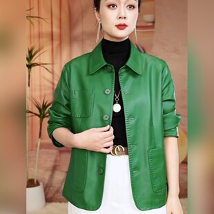 休闲皮衣女士外套2025秋新款 百搭宽松软皮夹克上衣女 高品质妈妈装
