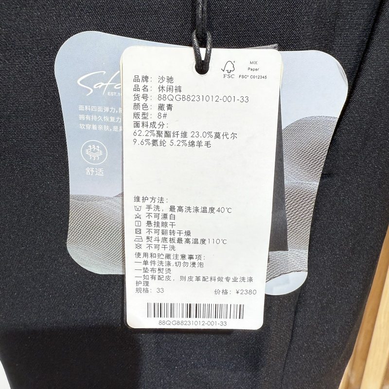88QGB8231012专柜2380 商务休闲绵羊毛直筒长裤 Satchi沙驰春款 男装