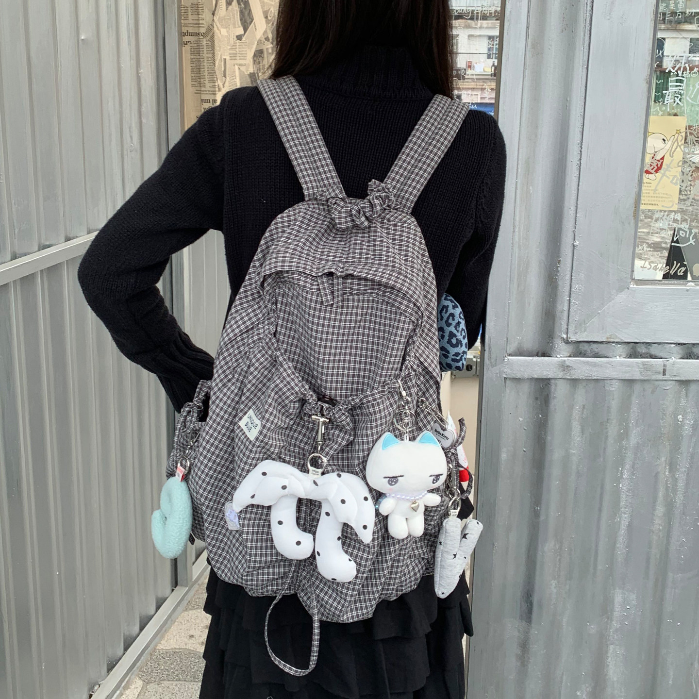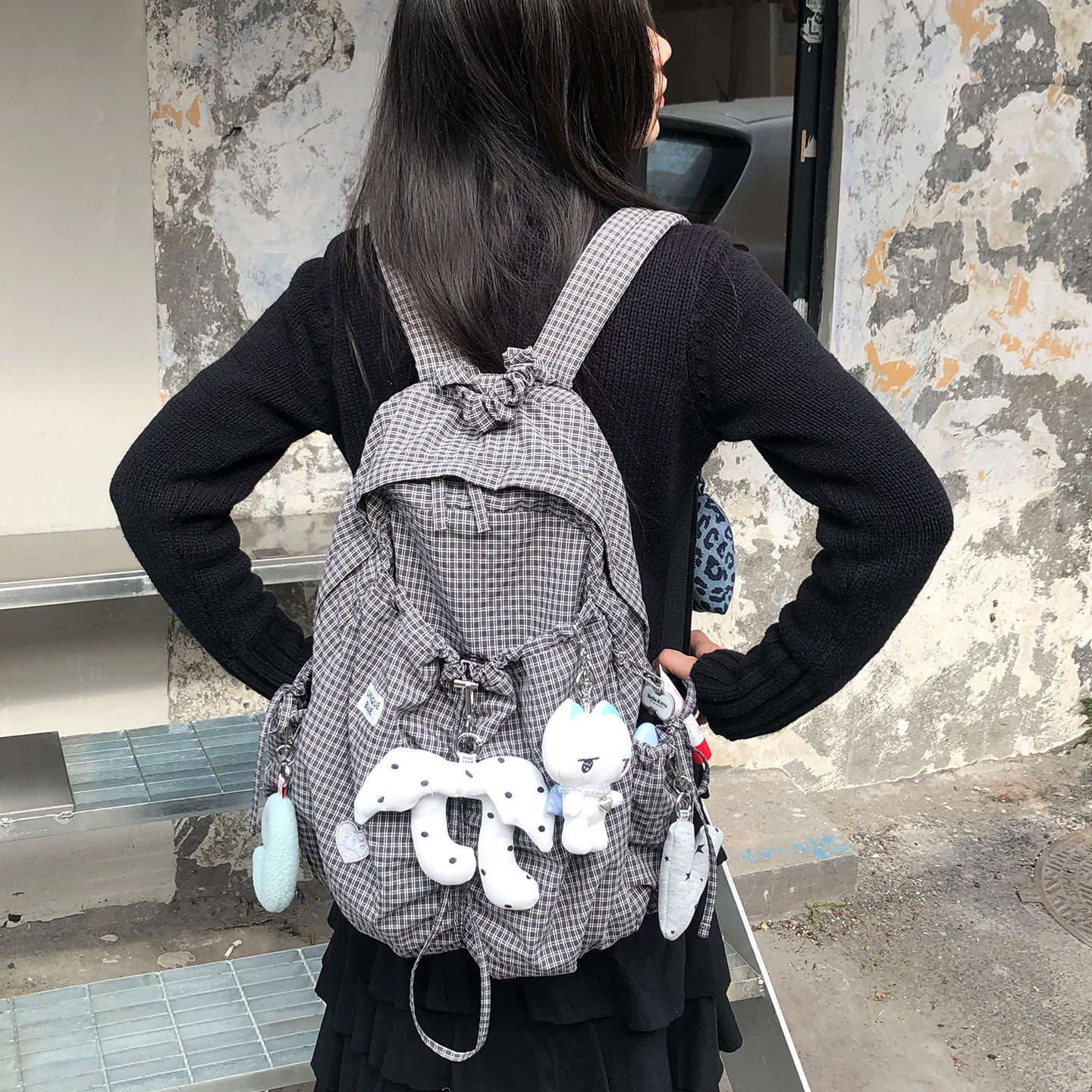 Unique 韩系格子双肩包女大容量学生书包百搭旅行通勤背包 blue
