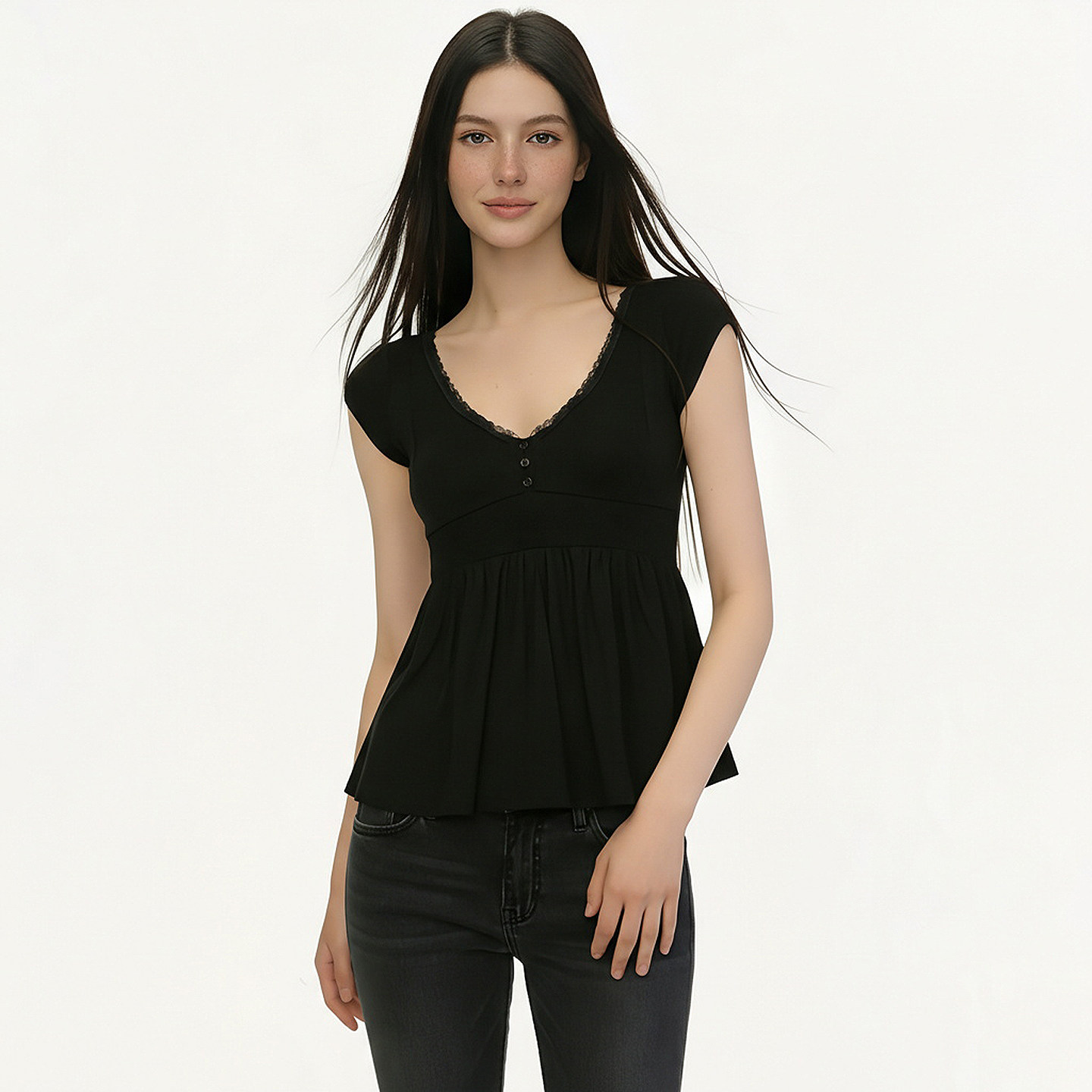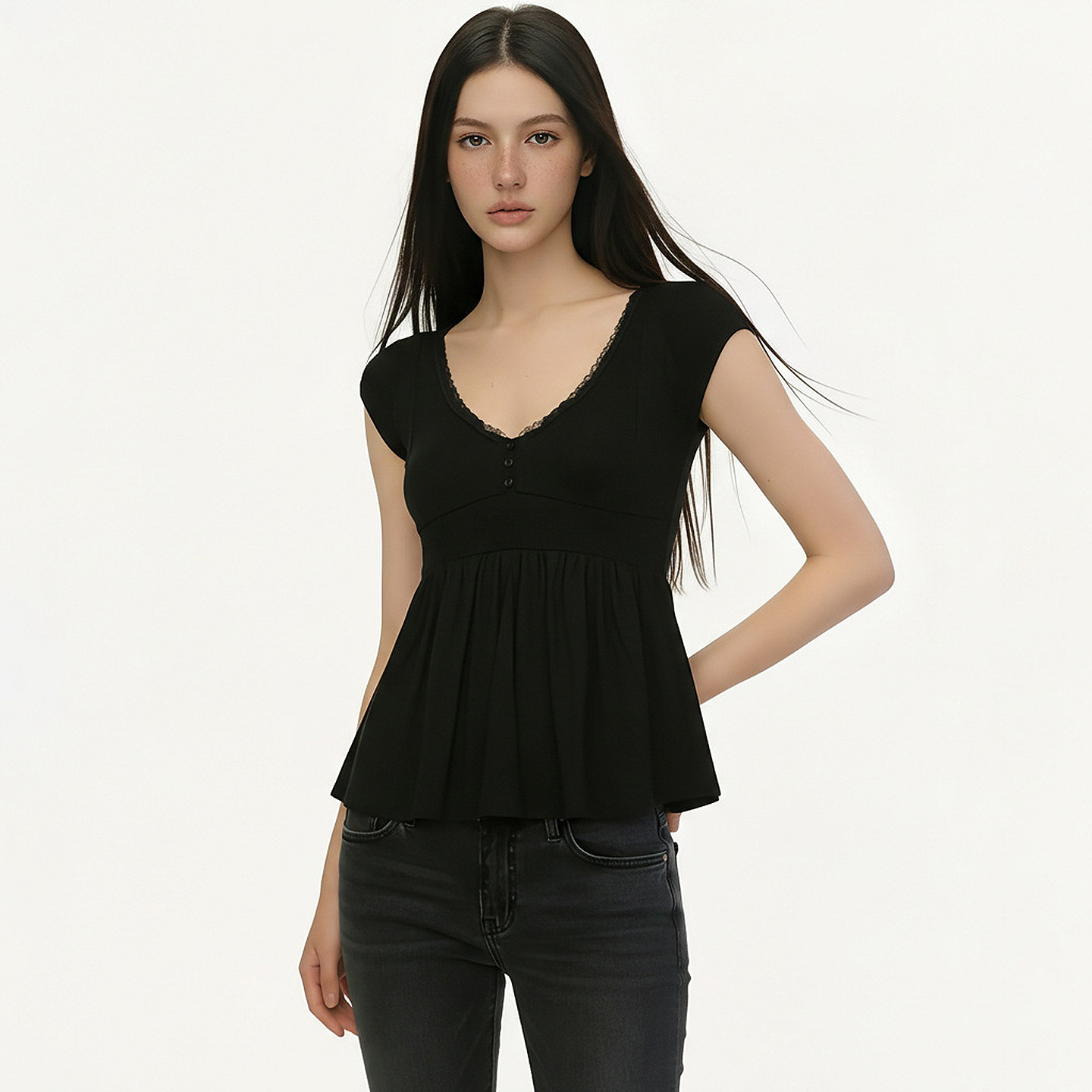 复古少女感修身 FUNOFF 娃娃衫 简约黑色蕾丝V领短袖 T恤上衣女 法式
