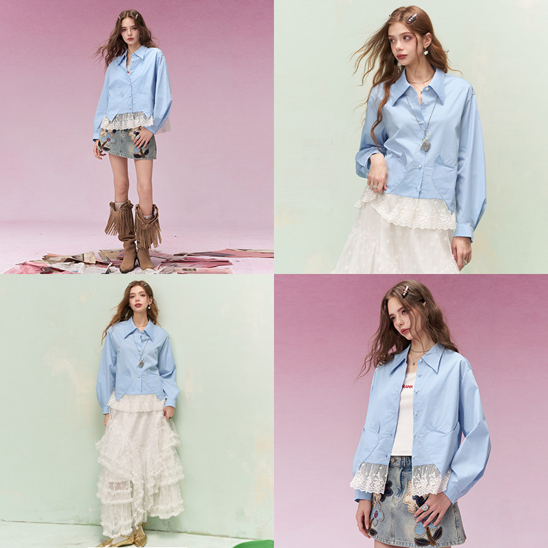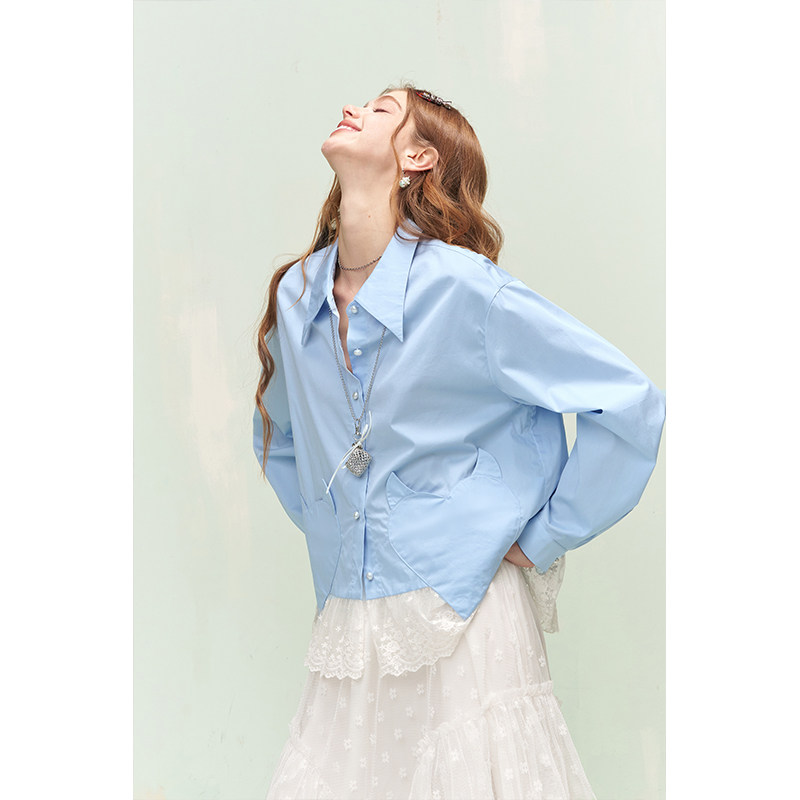 新款 妖精 女2026年春季 衬衫 设计感甜美上衣 口袋蕾丝拼接蓝色长袖