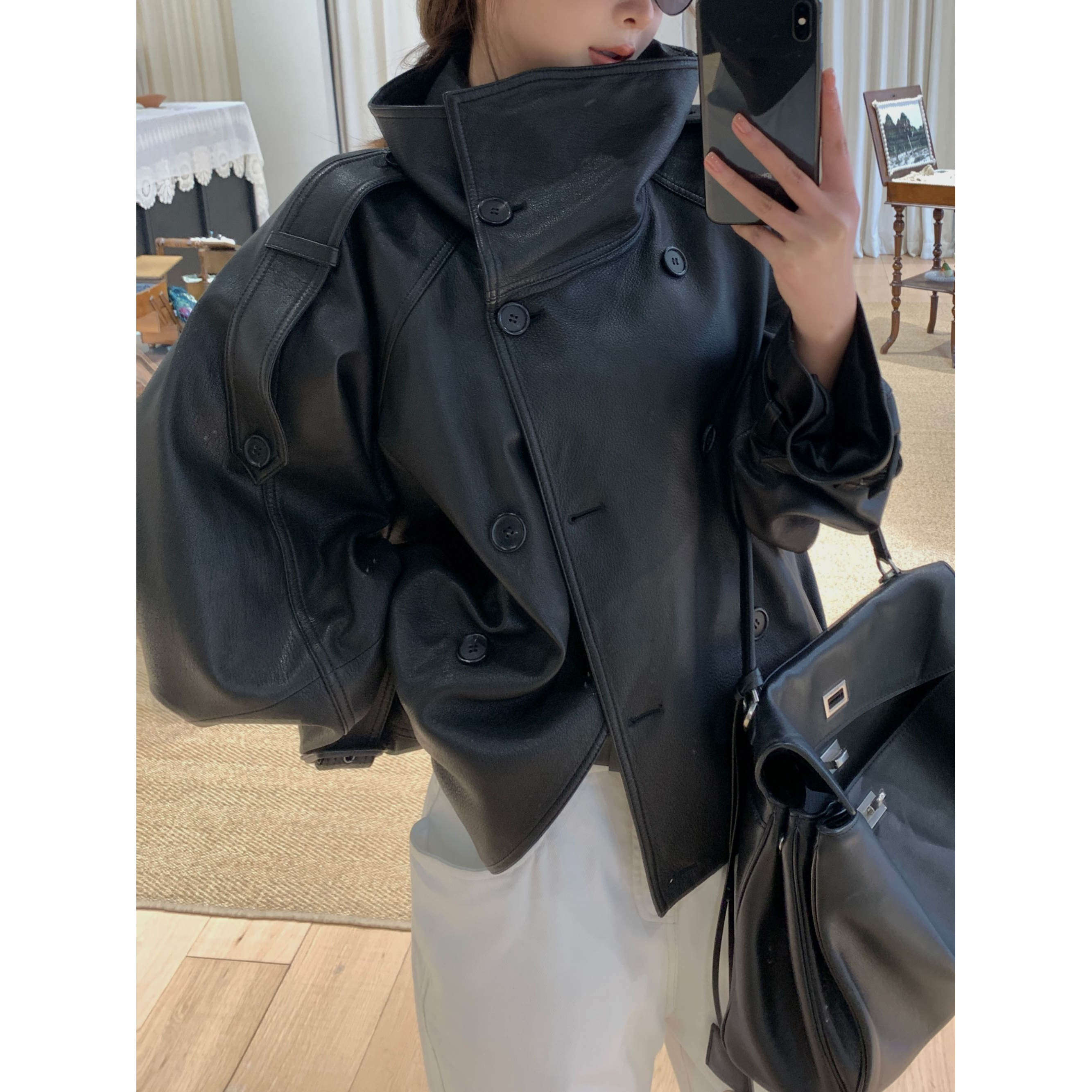 软糯缩纹慵懒皮衣酷飒真皮外套 西班牙进口A等级山羊皮 弓ECHO