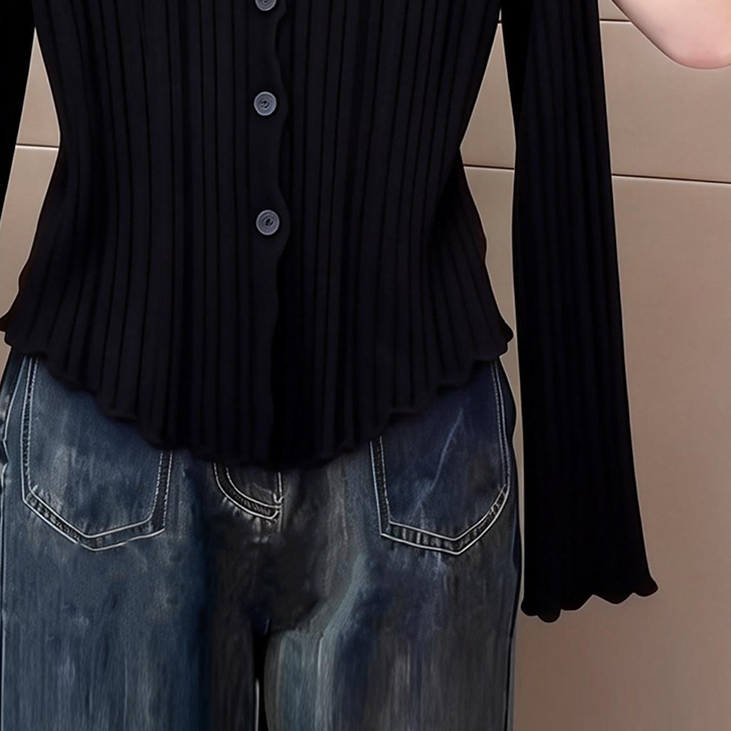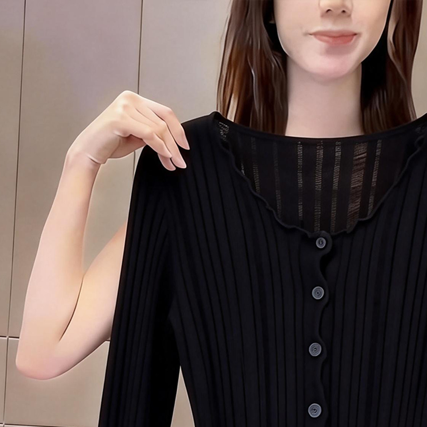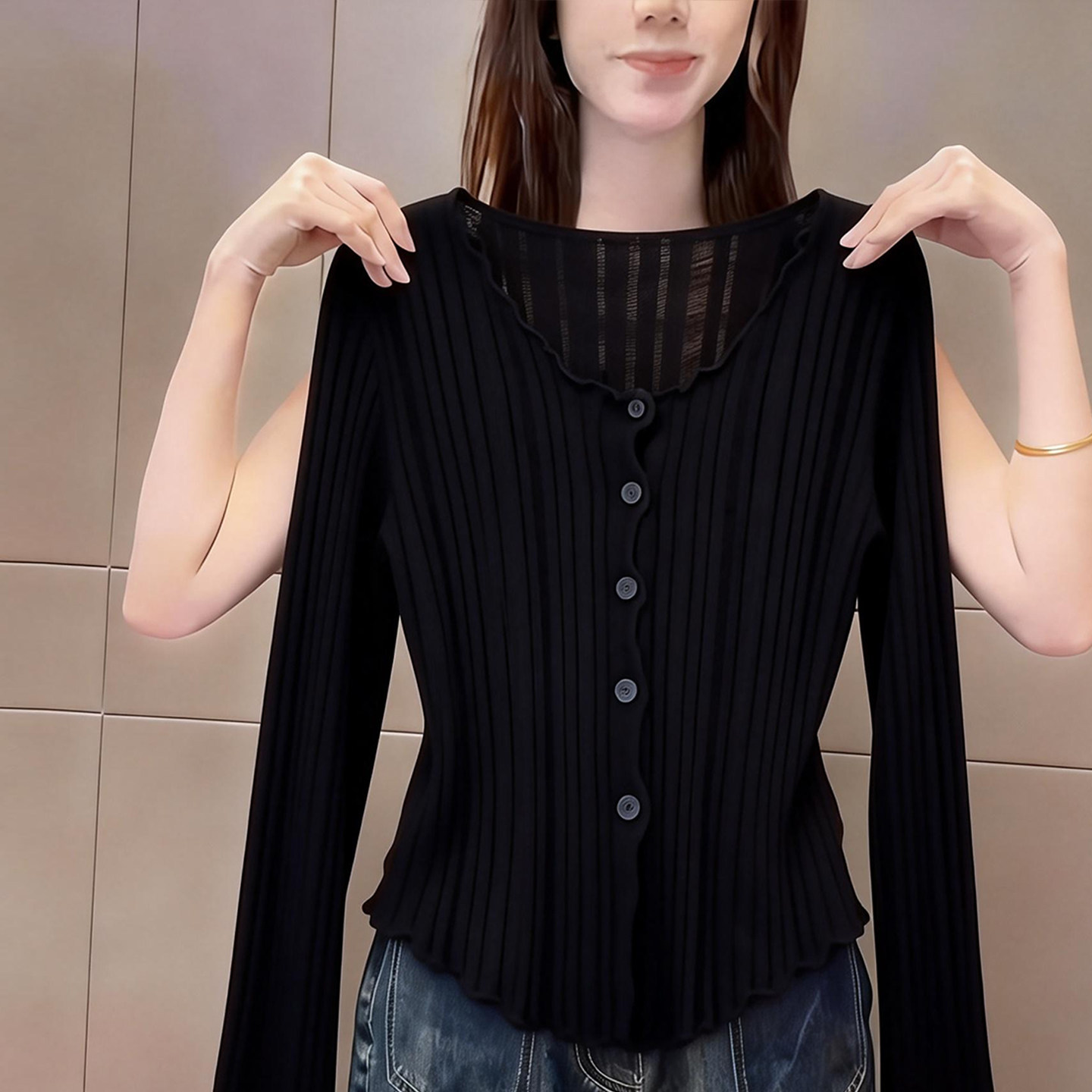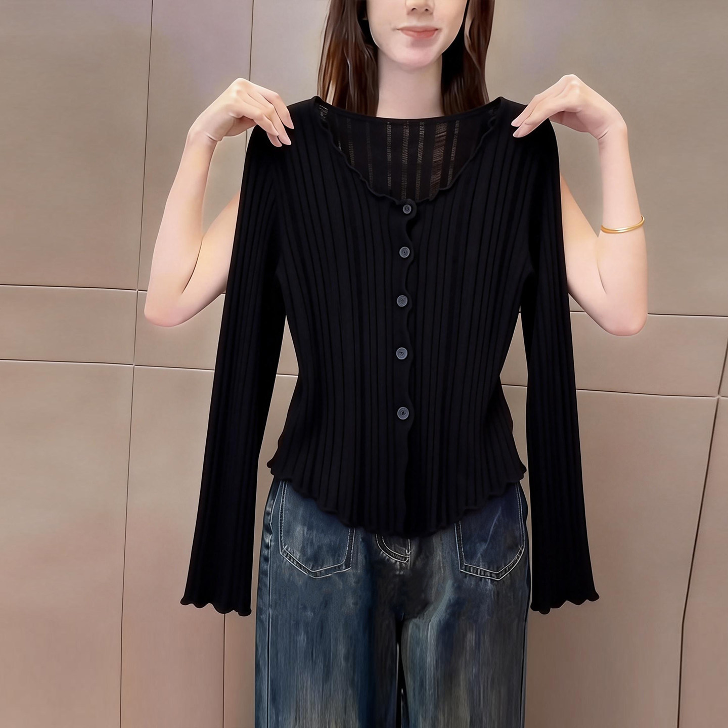 女修身 2026早春季 t恤开衫 黑色高级感v领长袖 显瘦百搭气质上衣 新款
