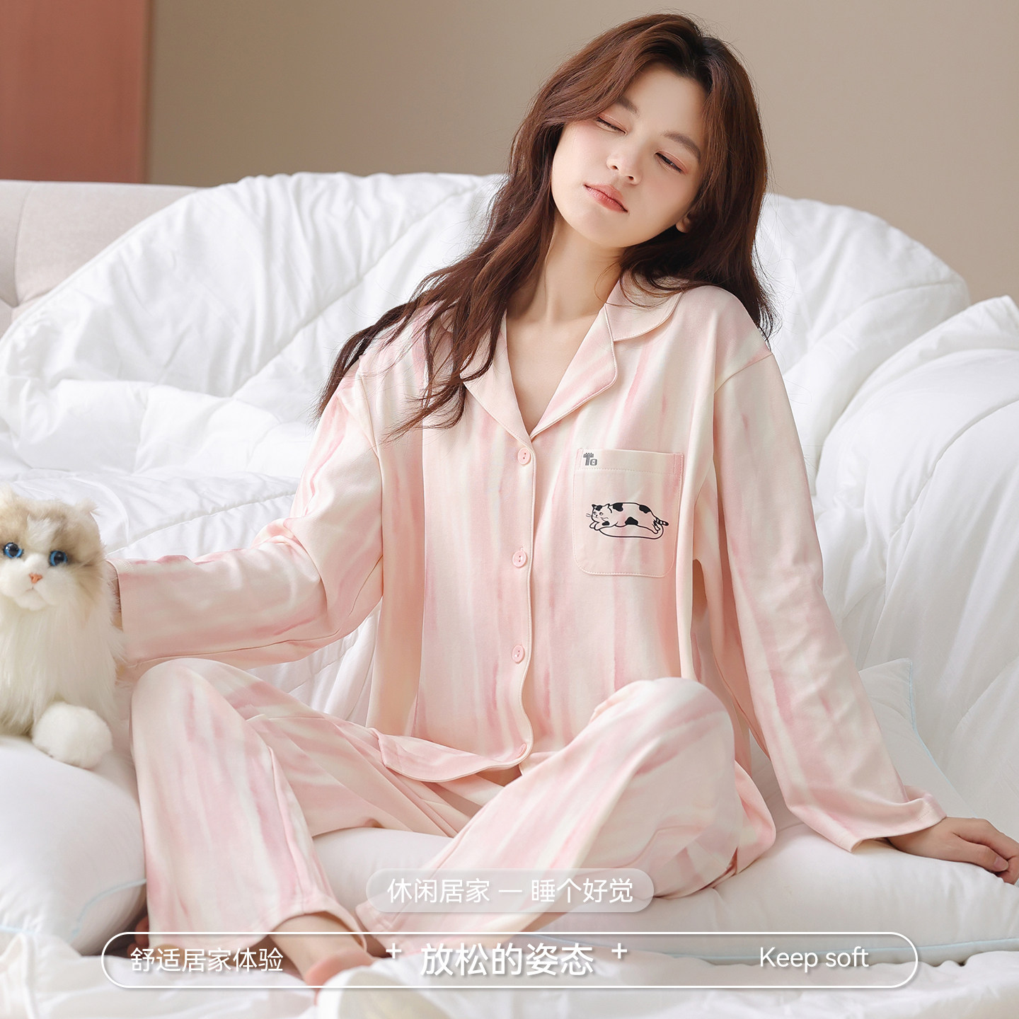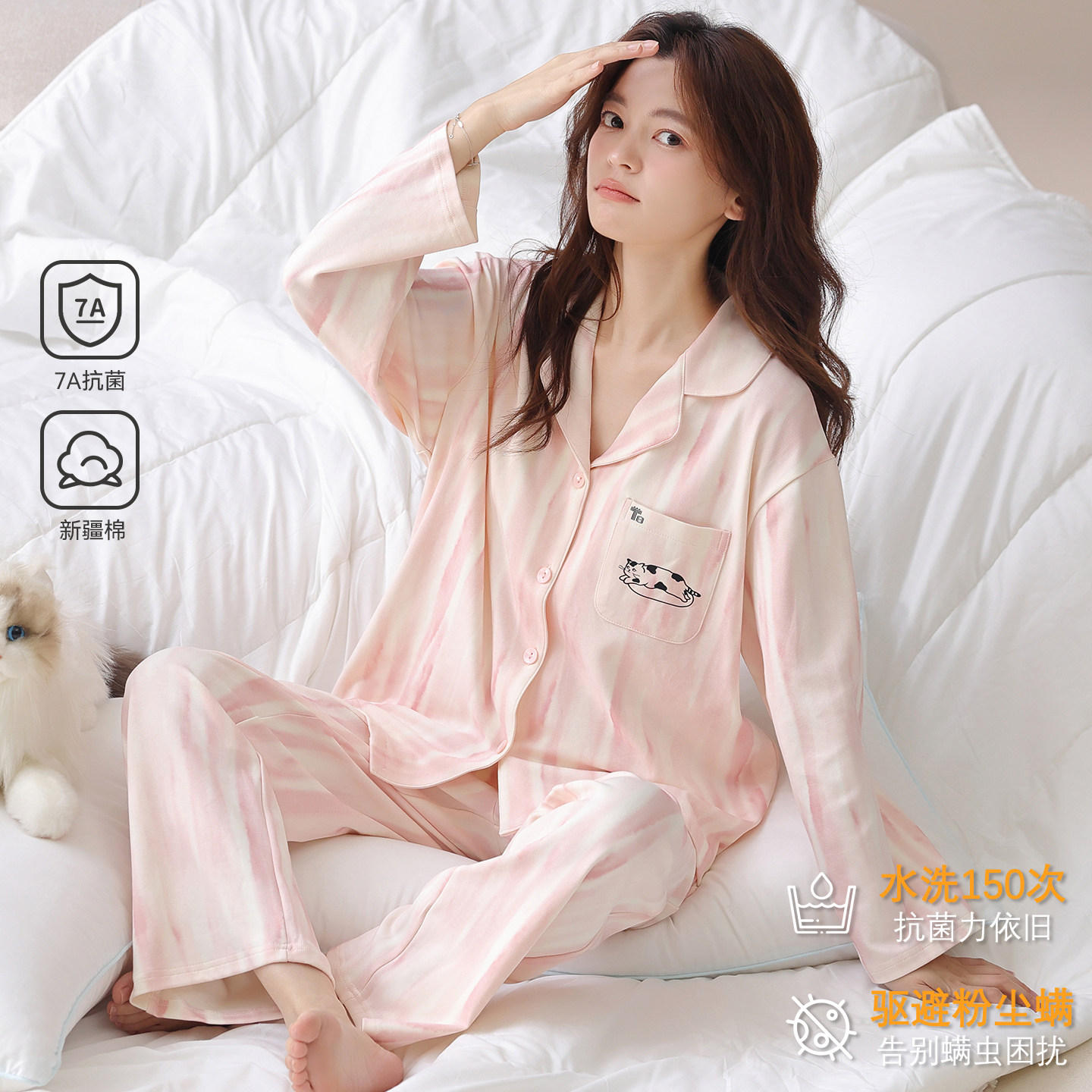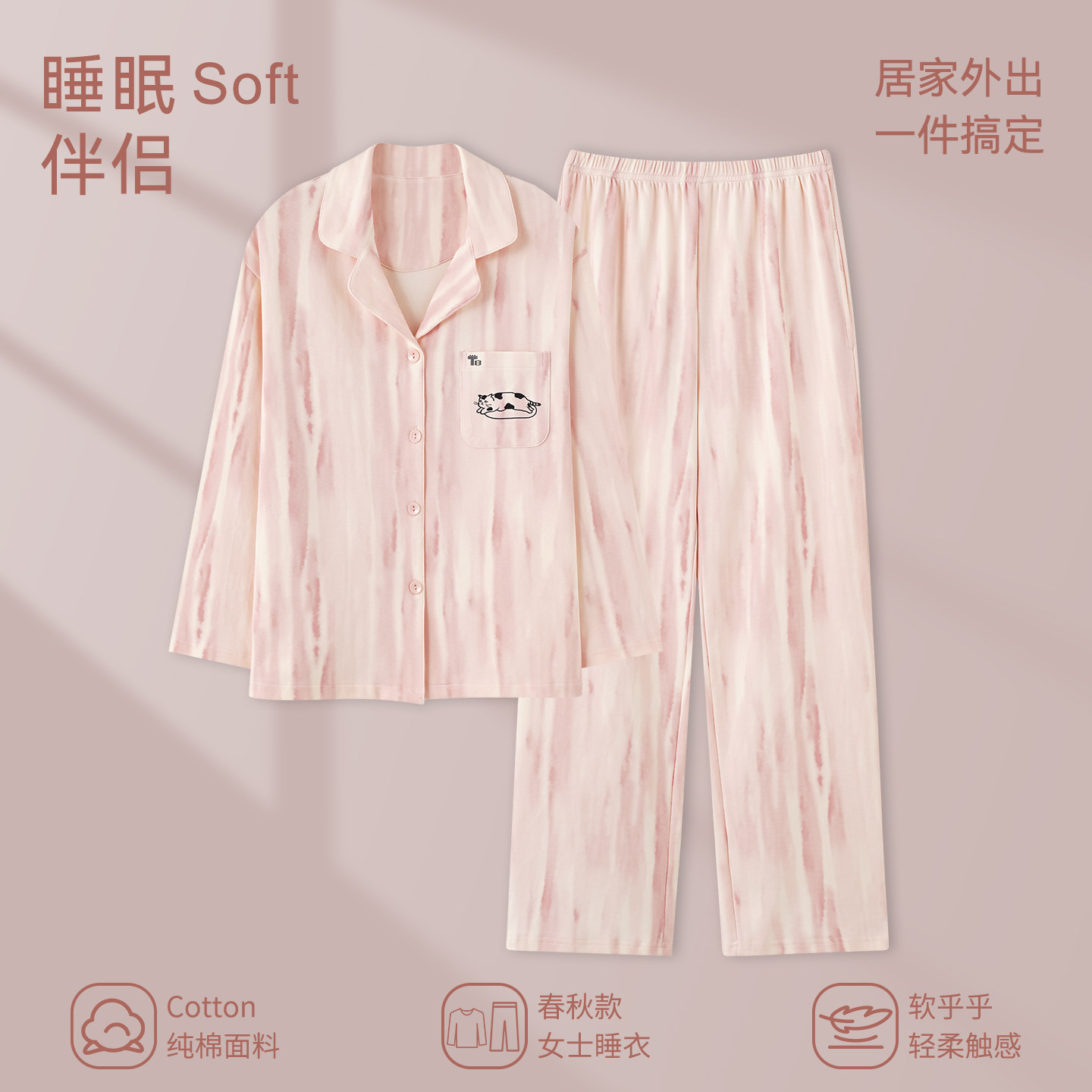 女士粉嫩家居服套装 芬腾可安睡衣女款 纯棉长袖 秋春季 夏天 2026新款