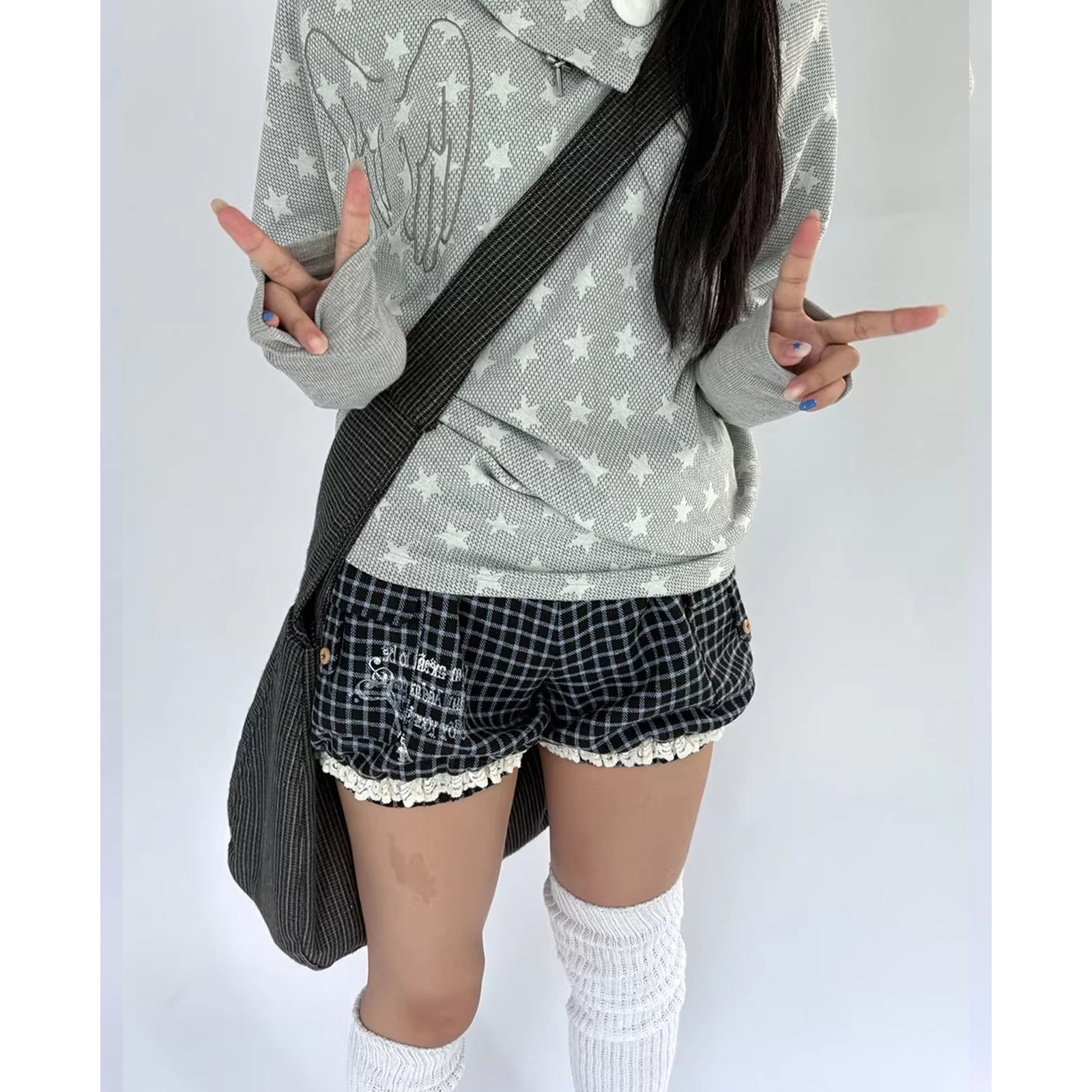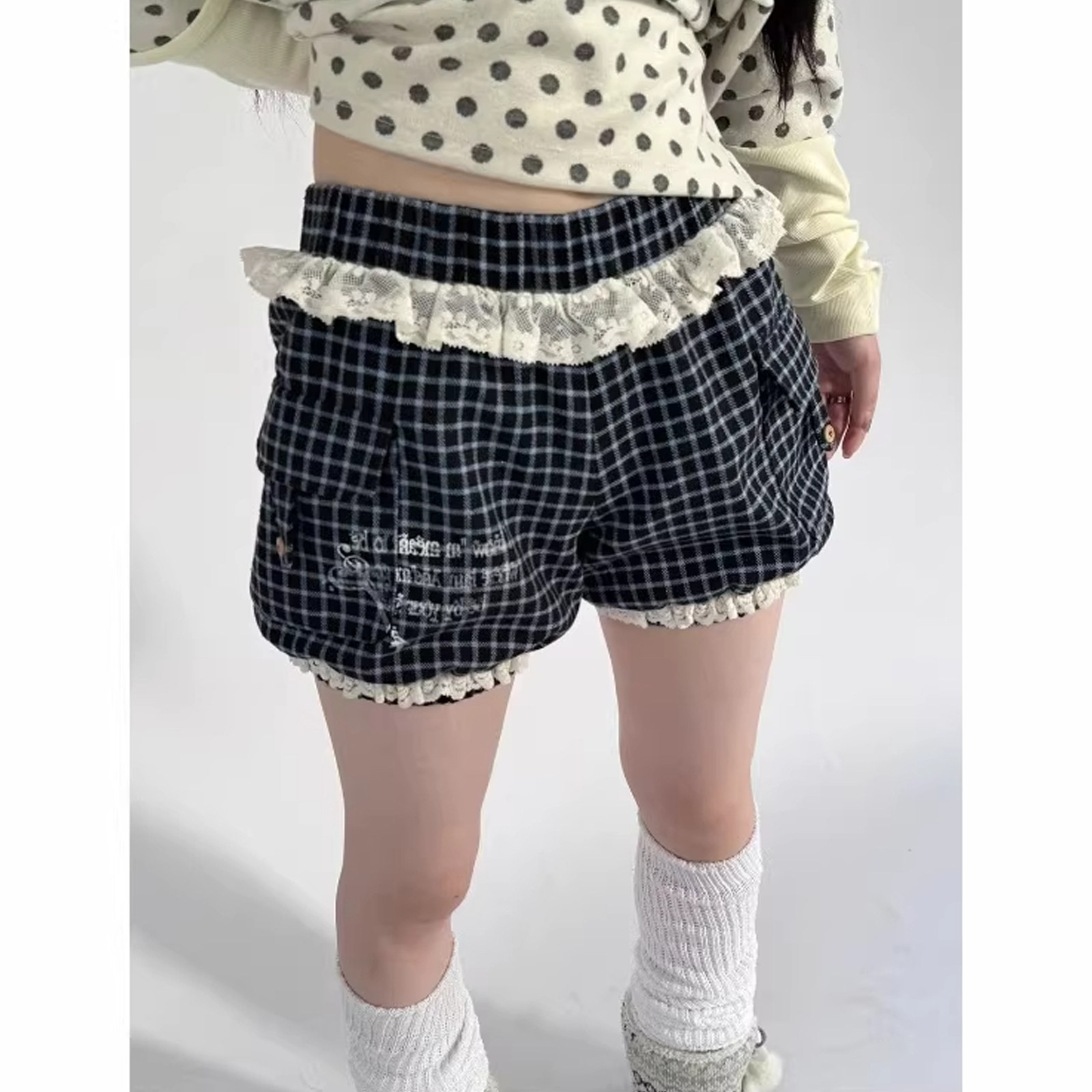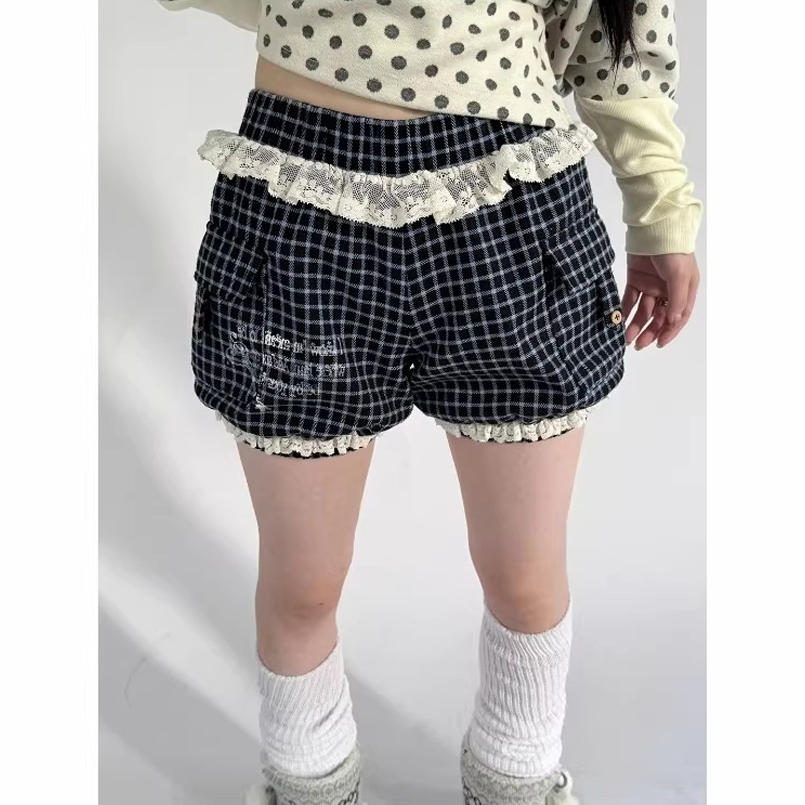 y2k裤 灯笼南瓜裤 子 高腰束脚裤 轻亚蕾丝花边拼接印花口袋格纹短裤