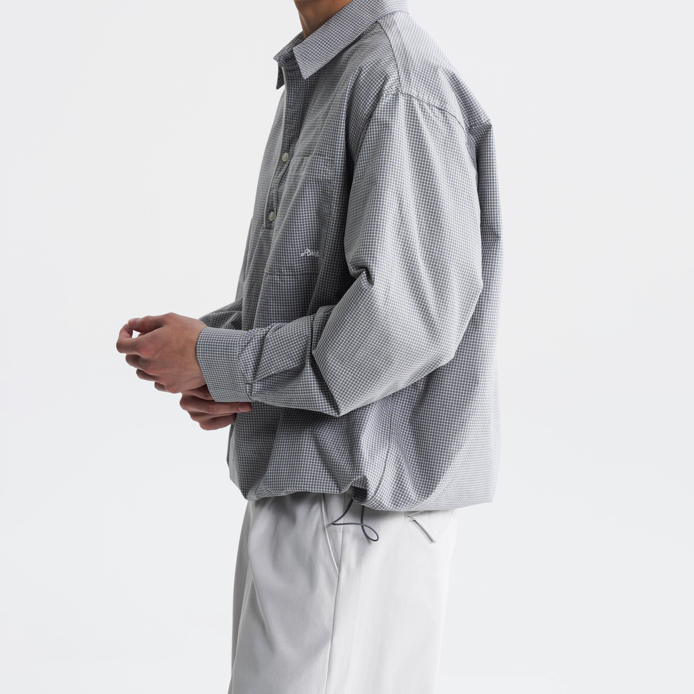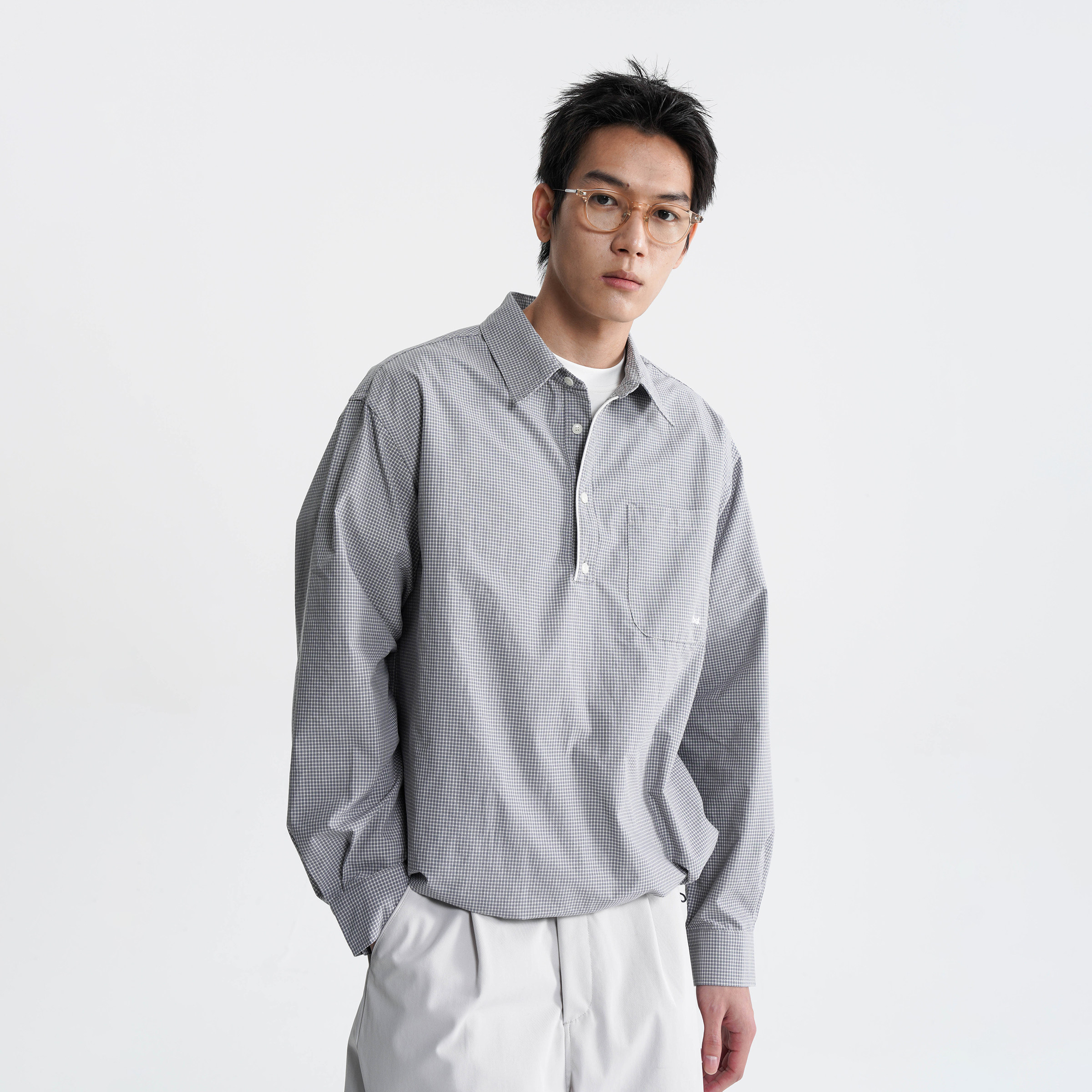 〔细格色织〕翻领嵌条半开领宽松衬衫 AWT 26SS