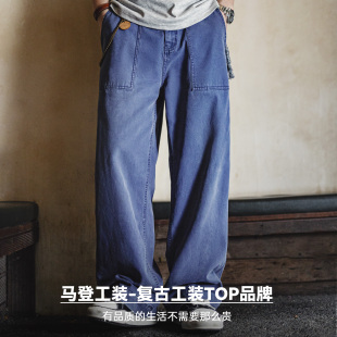 法式 水洗帆布宽松直筒休闲裤 复古亚工装 蓝色园丁裤 男春 裤 马登工装