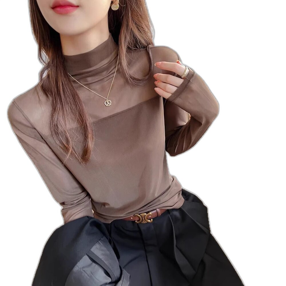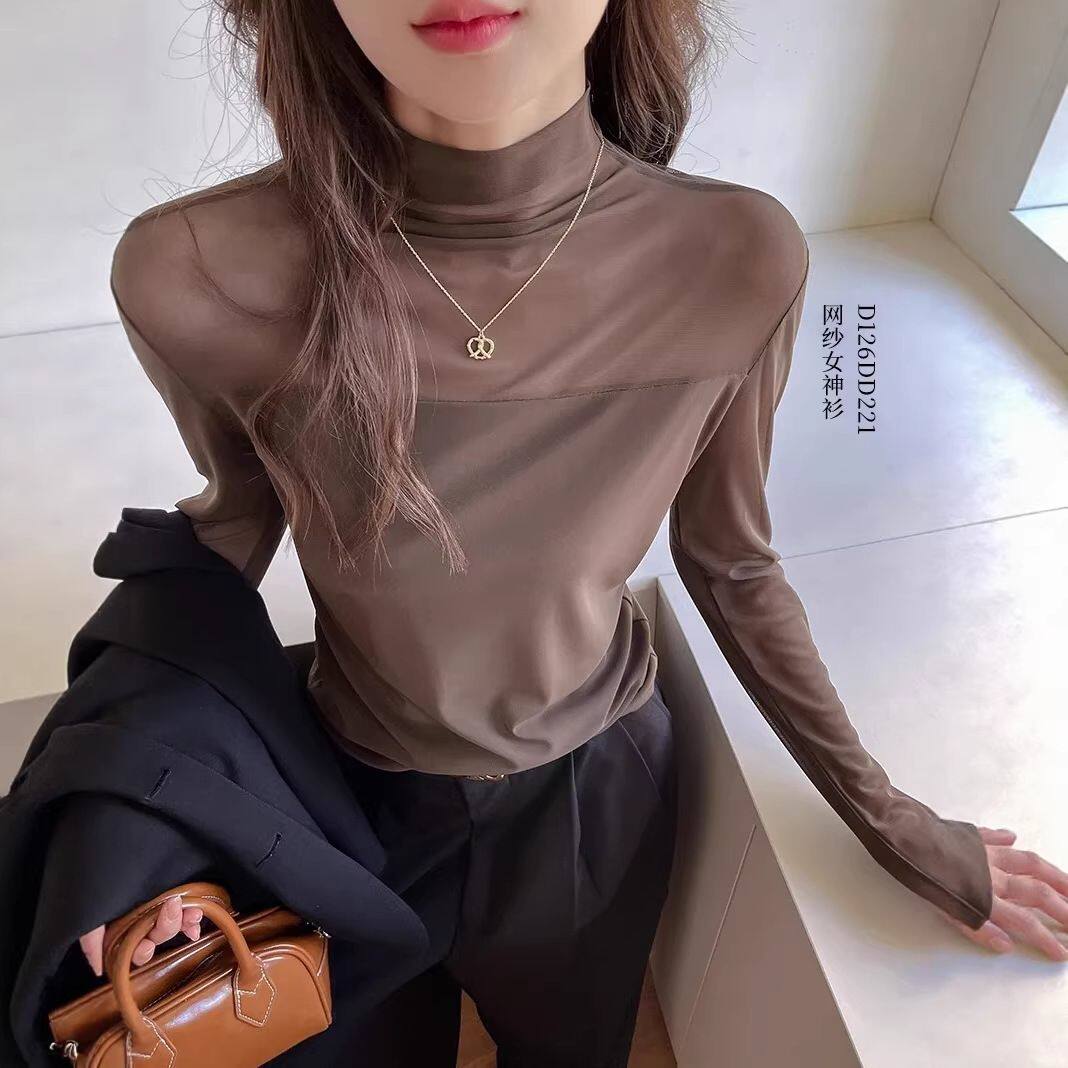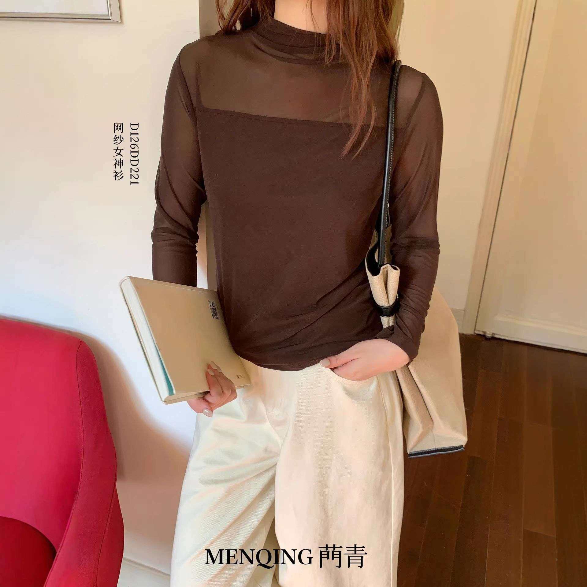 菛青网纱打底衫 薄纱高级感 黑色网纱半高领内搭蕾丝透明纱衣袖