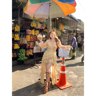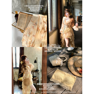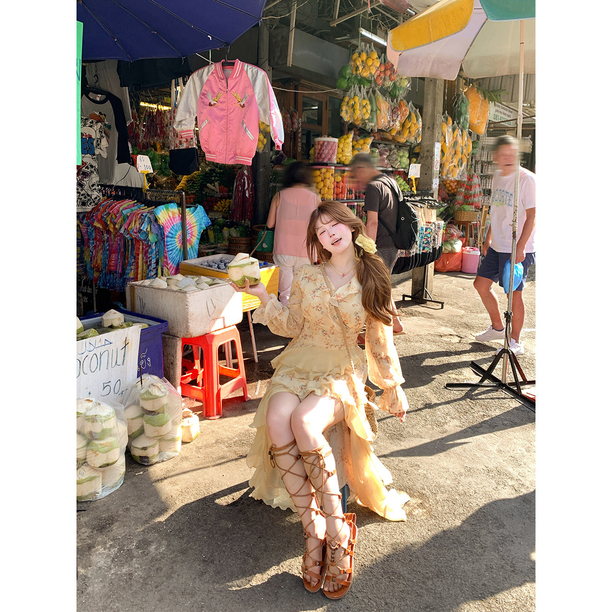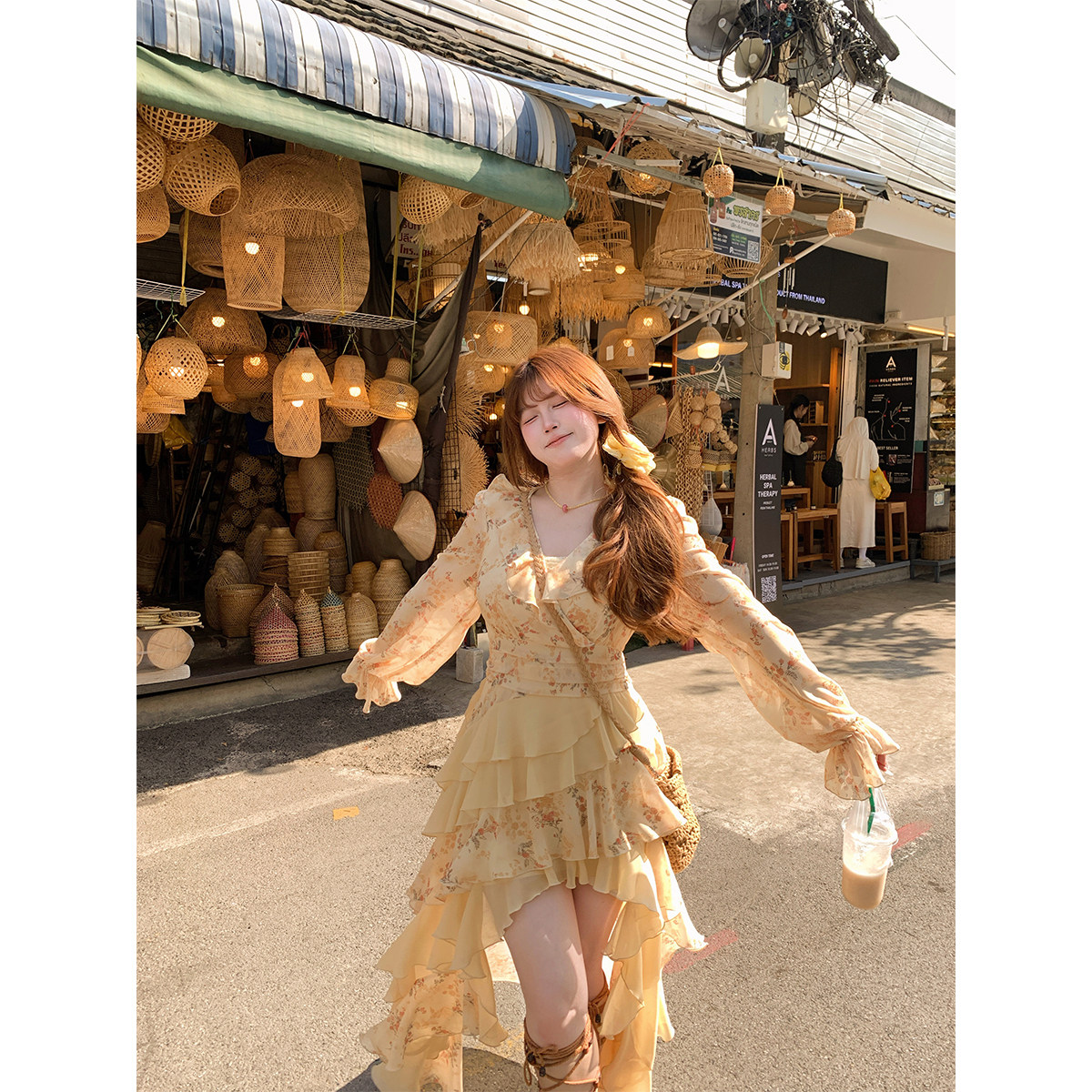 安妮不火 不规则长裙子 碎花荷叶边V领雪纺度假连衣裙女春微胖大码