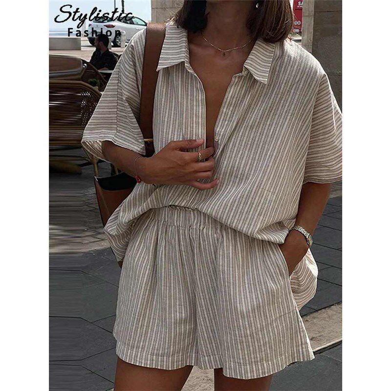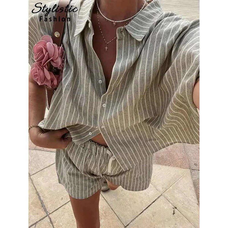 Shorts Set Short Striped Slee Lapel Shirt Loose Casual Women