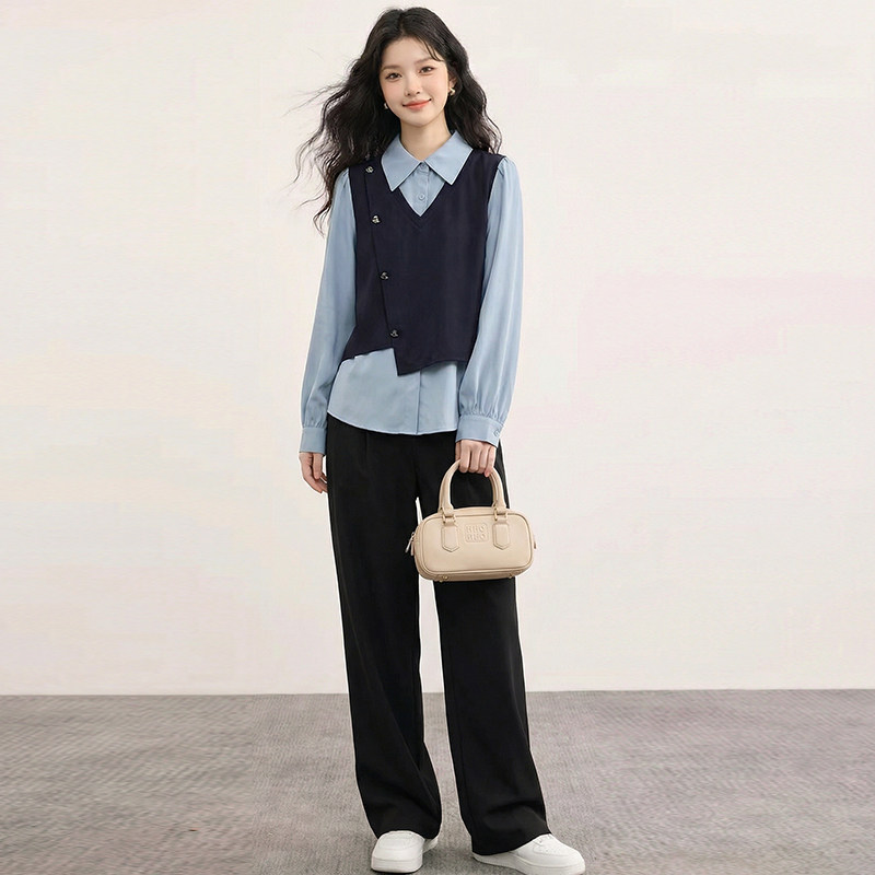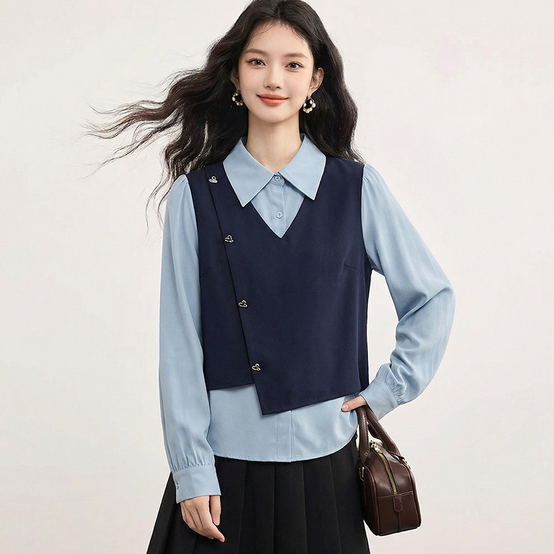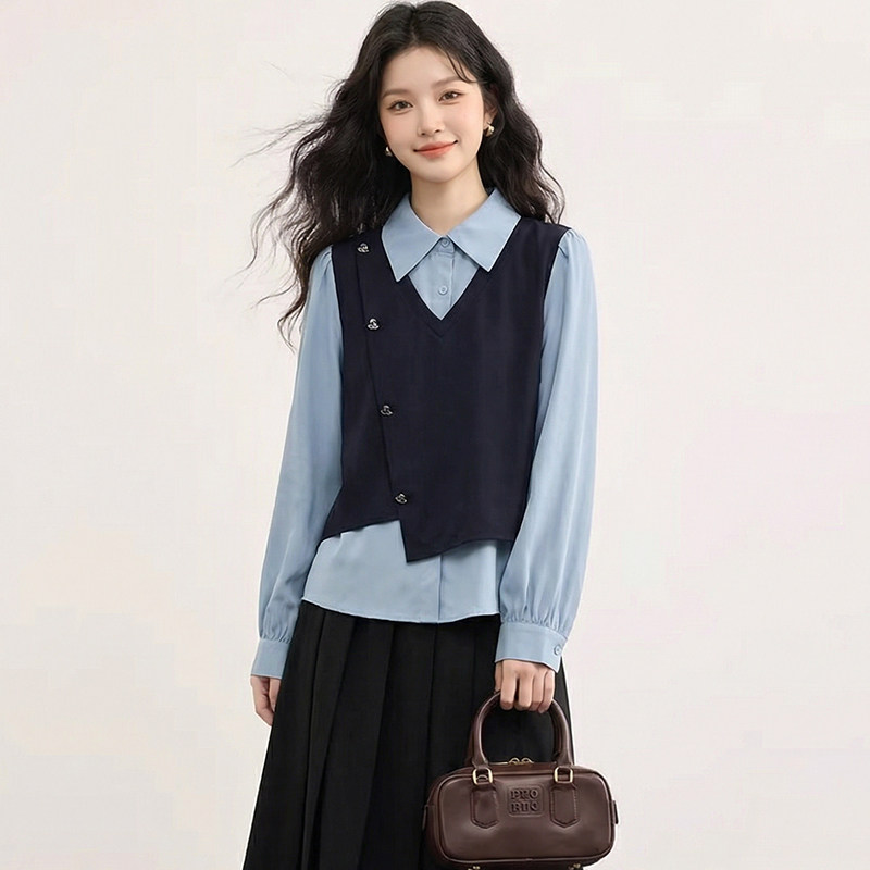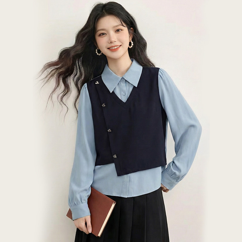 胖mm显瘦遮肚设计感正肩上衣女 大码 绮娑2026长袖 假两件学院风衬衫