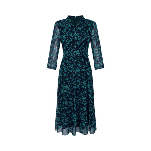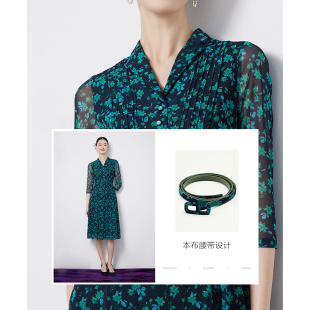黛玛诗春新款 连衣裙A字裙城市通勤 优雅V领绿色印花网纱裙女中长款