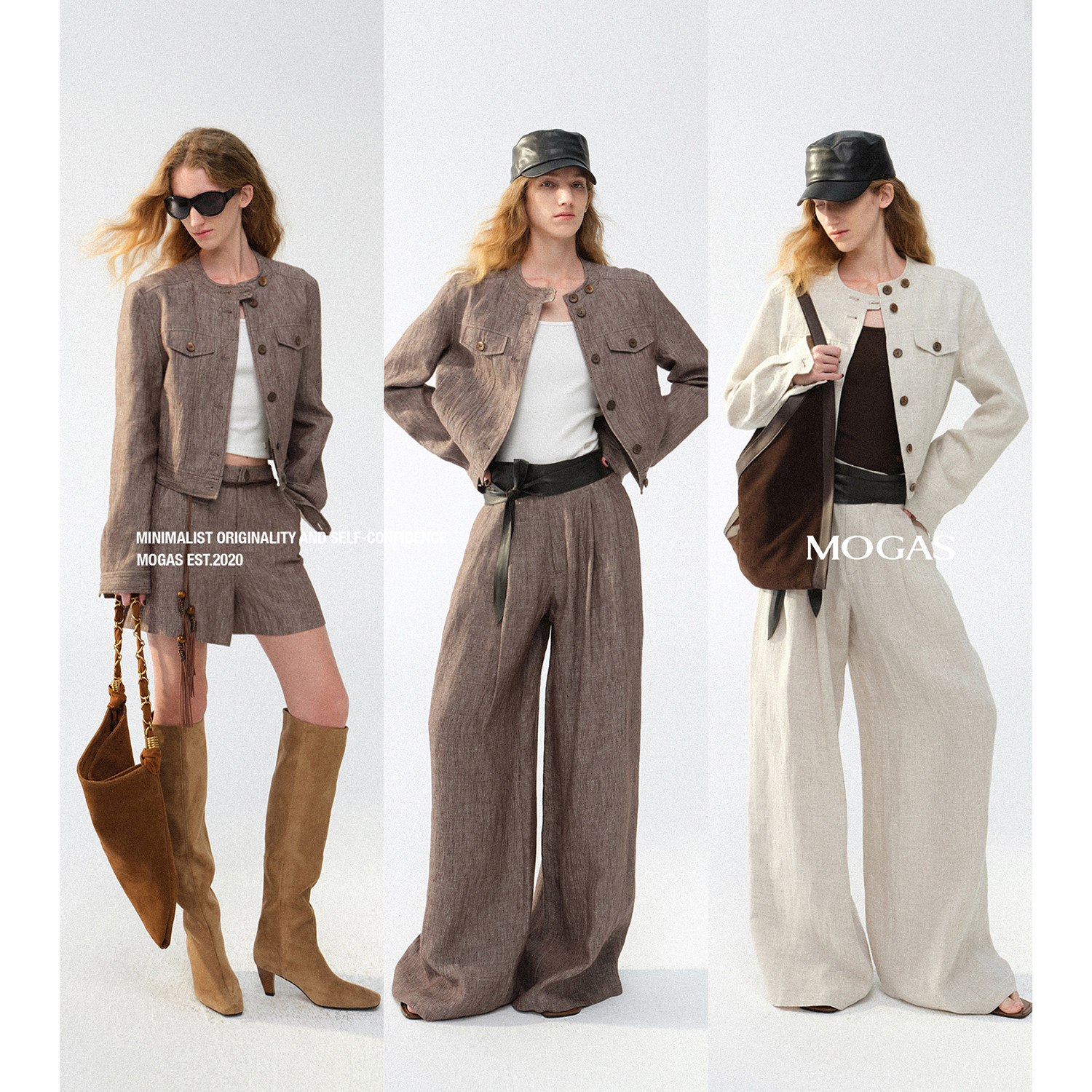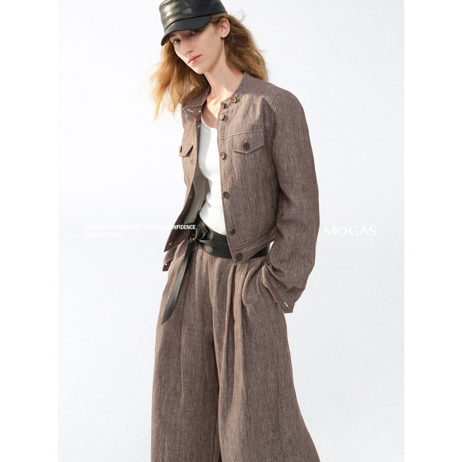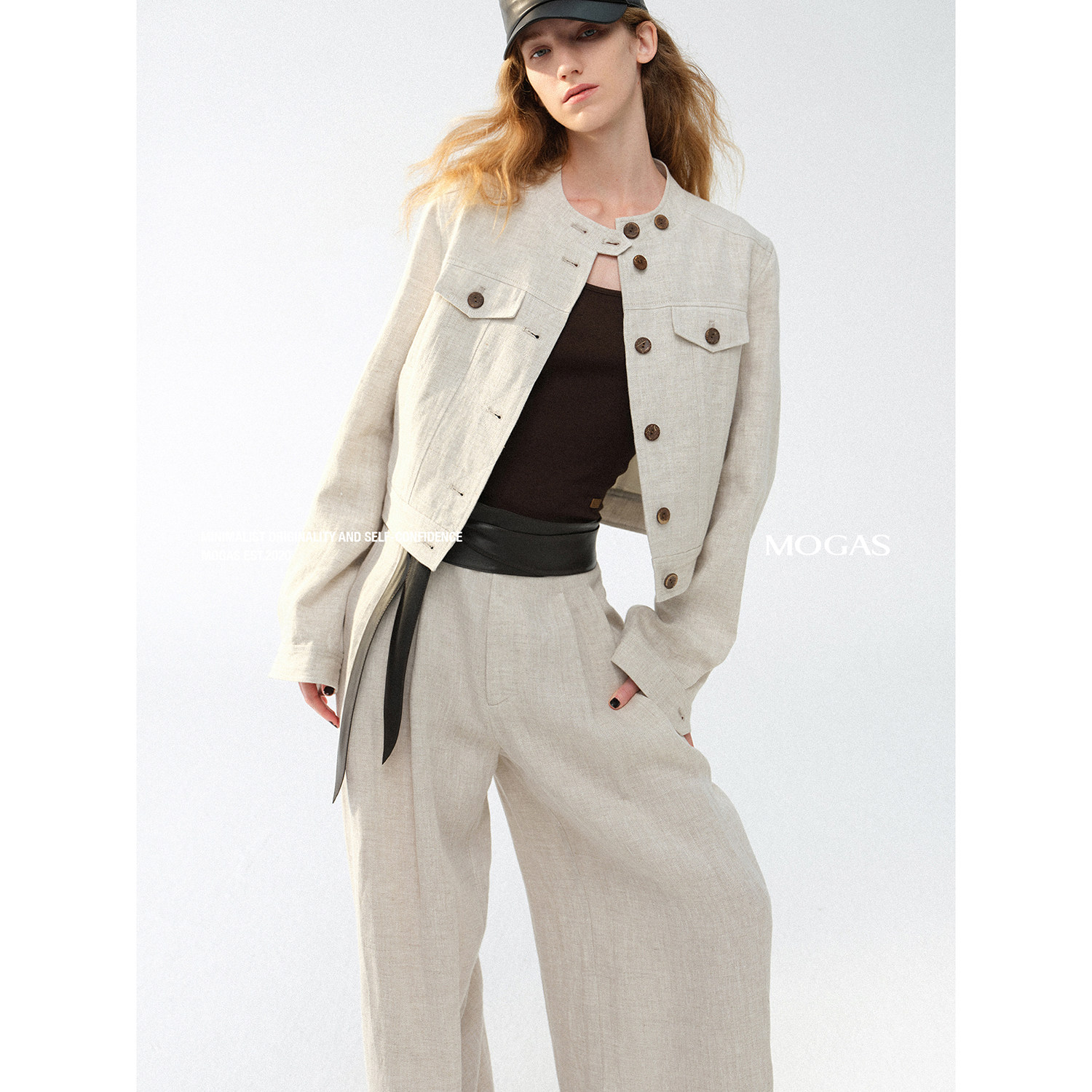 100纯亚麻圆领短外套阔腿裤 Mogas不费力老钱套装 真皮腰封 现货