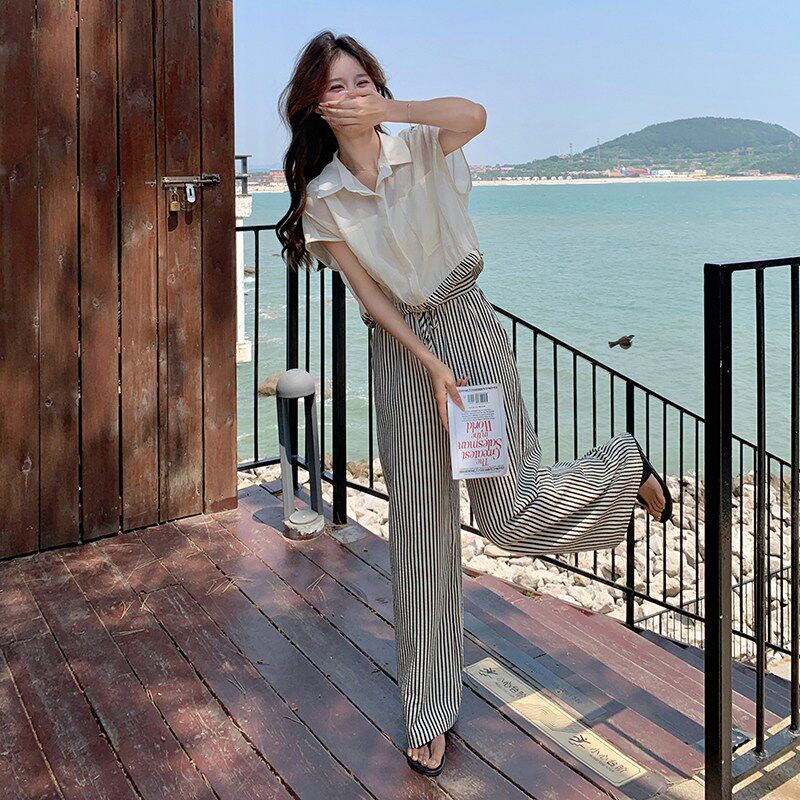 薄款 衬衫 条纹阔腿裤 现货 2C135 新款 两件套装 5091P110K168 夏装
