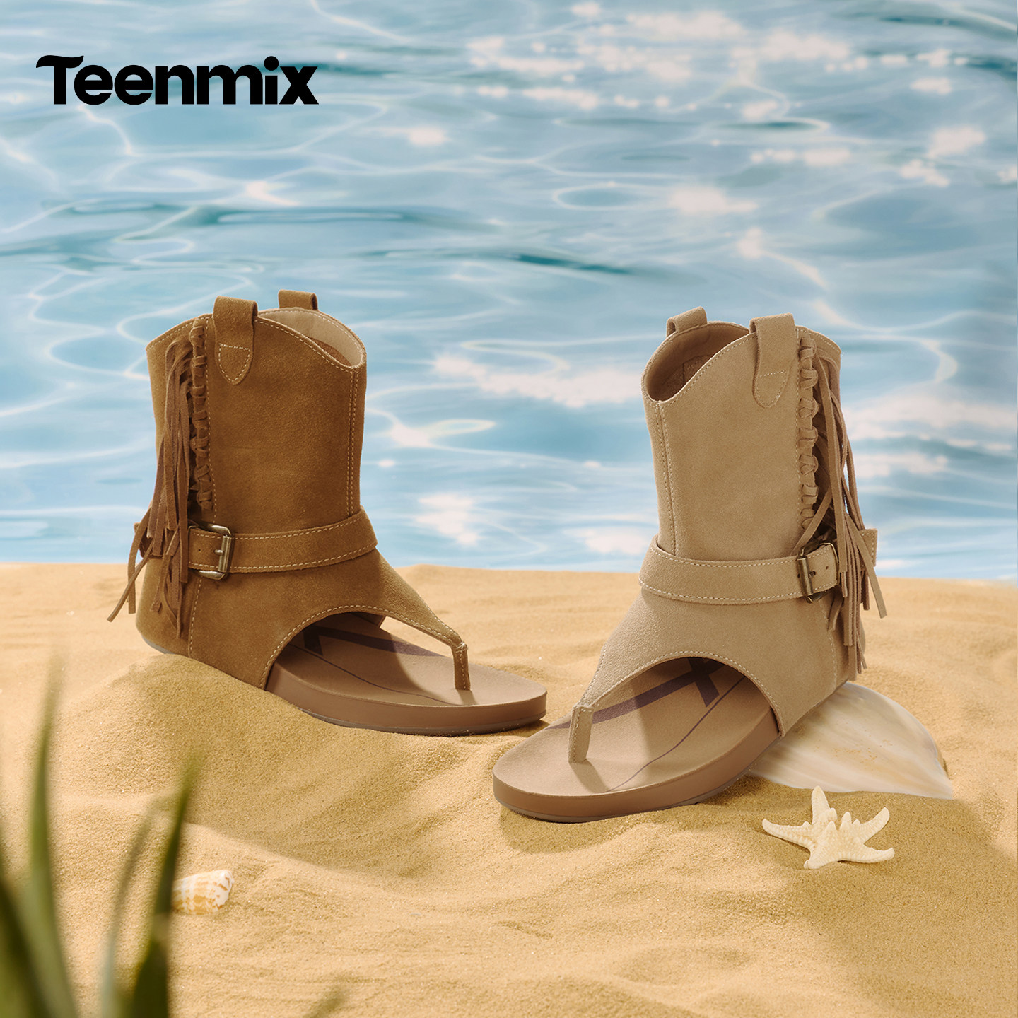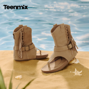 天美意复古夹趾流苏套筒凉靴人字拖女外穿平底罗马凉鞋 2026夏新款